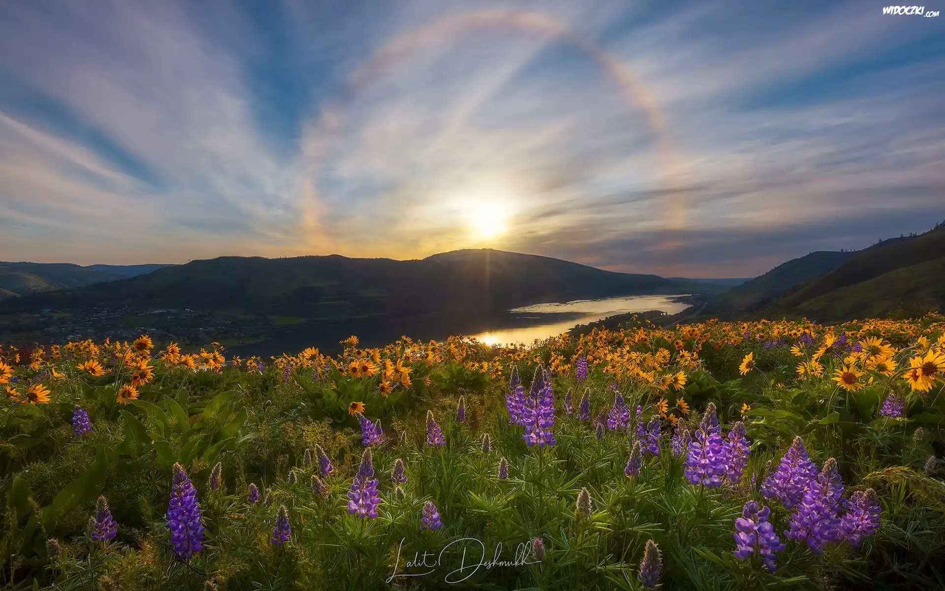 Rezerwat przyrody Columbia River Gorge, Góry Kaskadowe, Rzeka Kolumbia, Żółte, Kwiaty, Balsamorhiza, Łubin, Łąka, Słoneczny blask, Stan Waszyngton, Stany Zjednoczone |