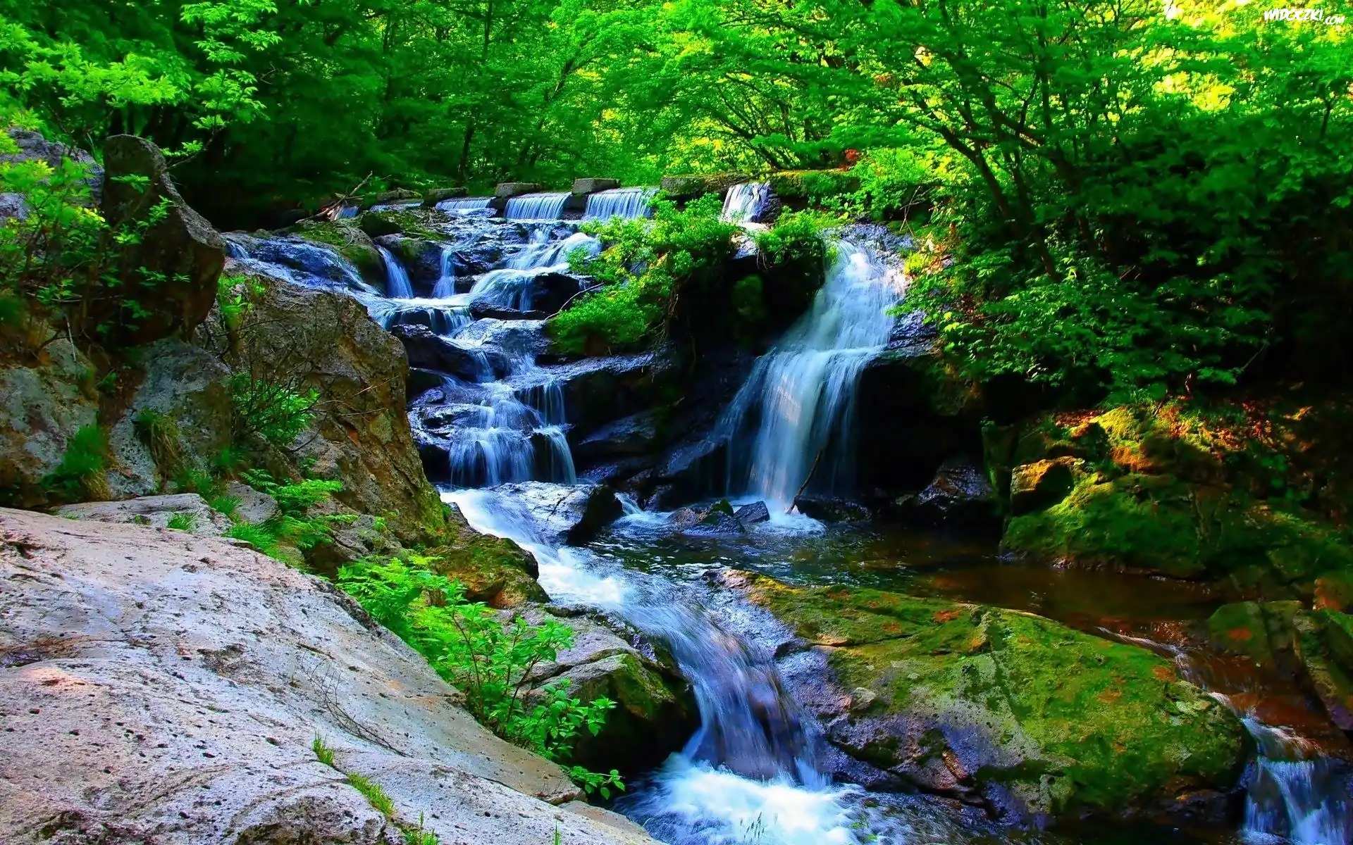 Kaskadowy, Wodospad, Las, Drzewa, Skały