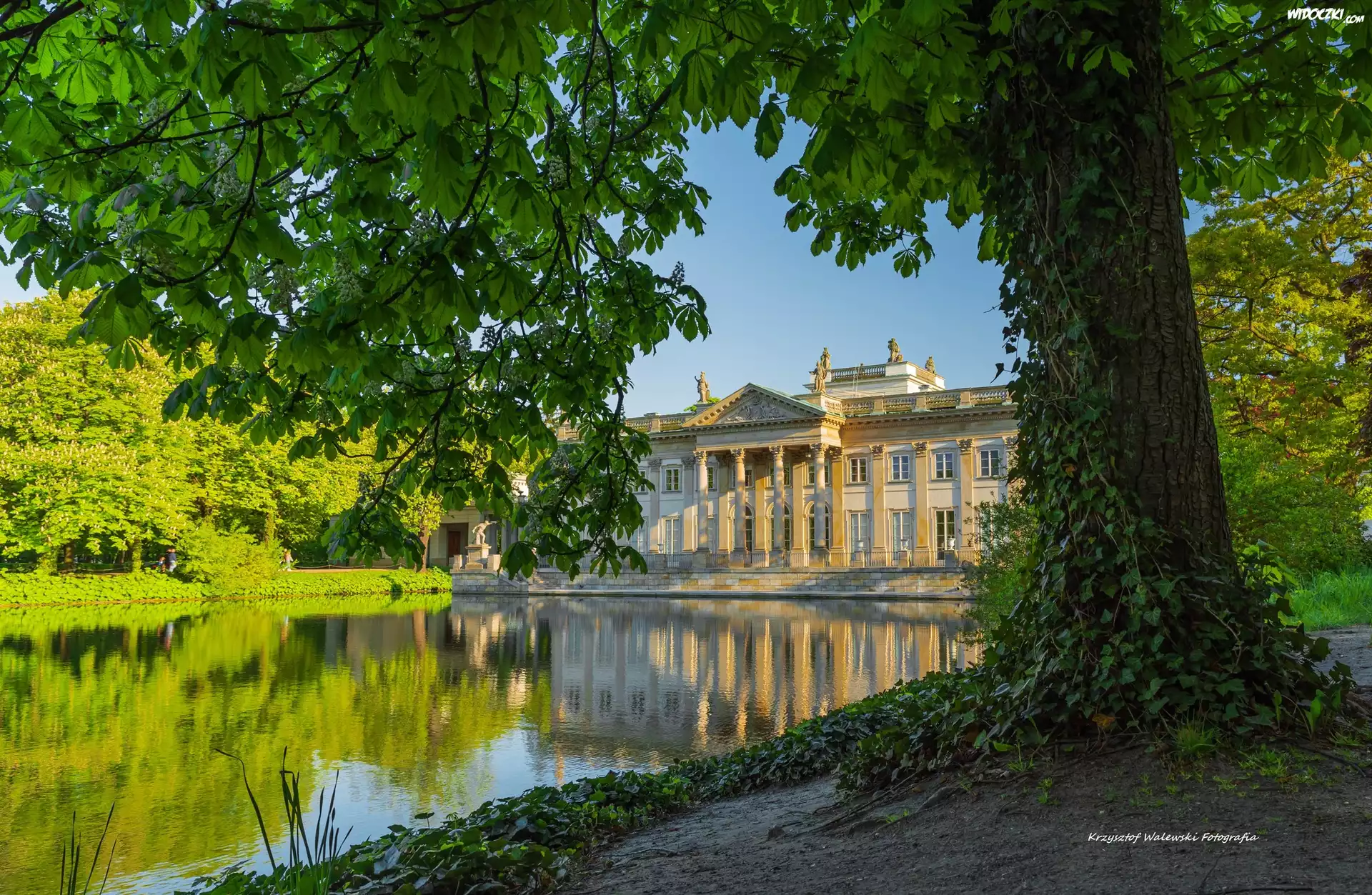 Zdjęcia, Pałac na Wyspie, Staw, Drzewa, Kwitnący, Kasztanowiec, Łazienki Królewskie, Warszawa, Polska