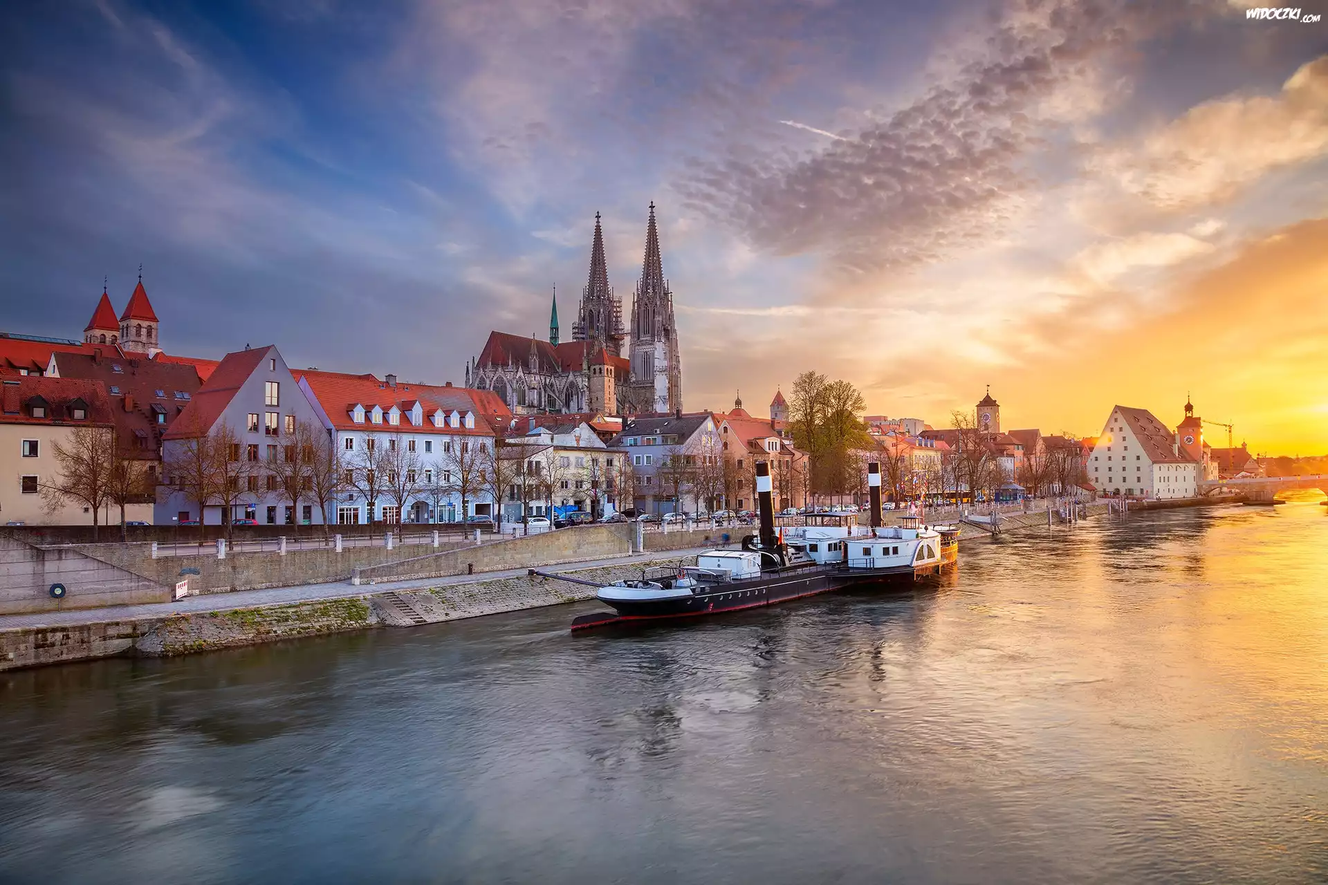 Niemcy, Regensburg, Miasto Ratyzbona, Katedra św Piotra, Rzeka Dunaj, Nabrzeże, Parowiec, Domy, Zachód słońca |