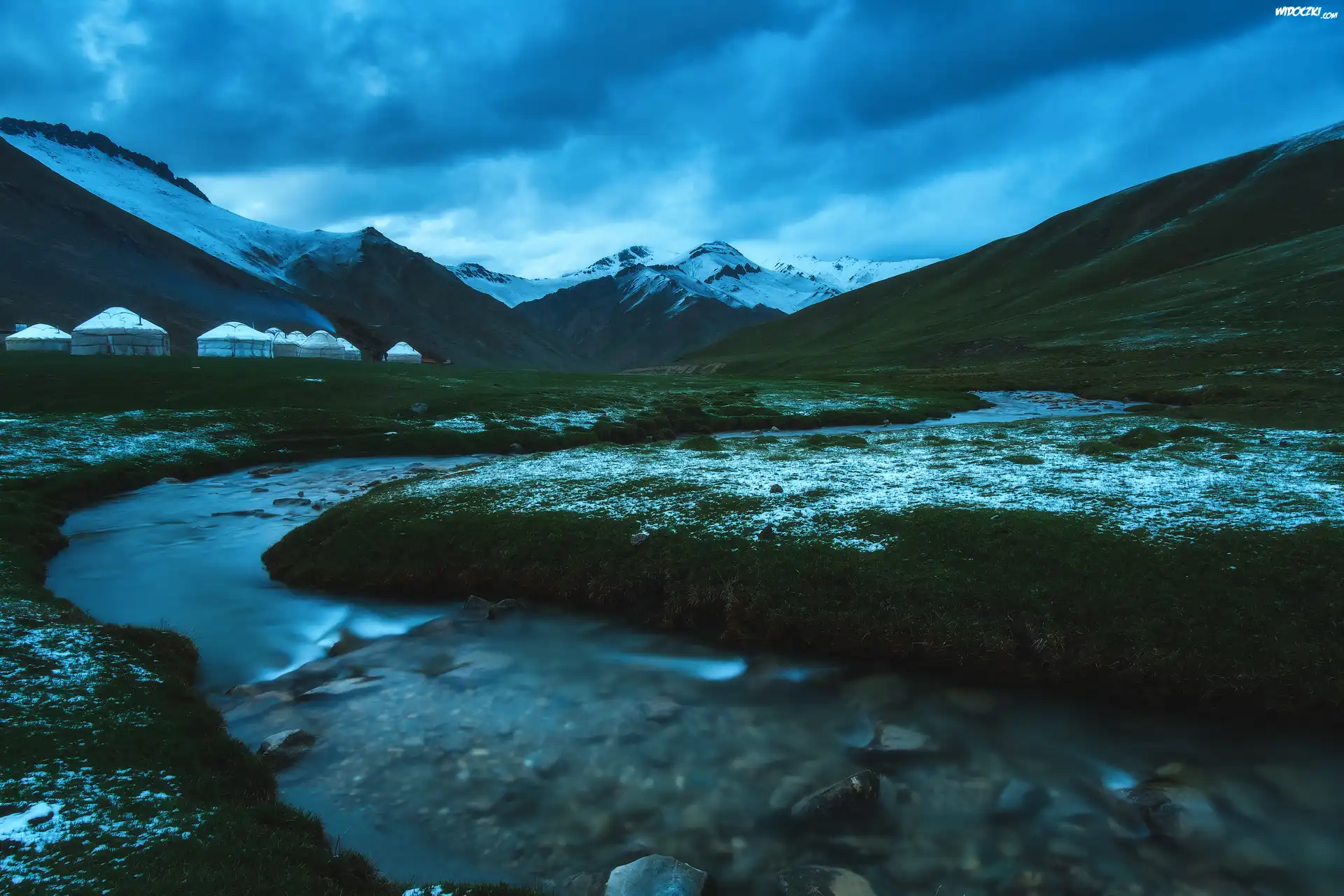 Zdjęcia, Góry, Rzeka, Śnieg, Trawa, Tash Rabat, Obwód naryński, Kirgistan