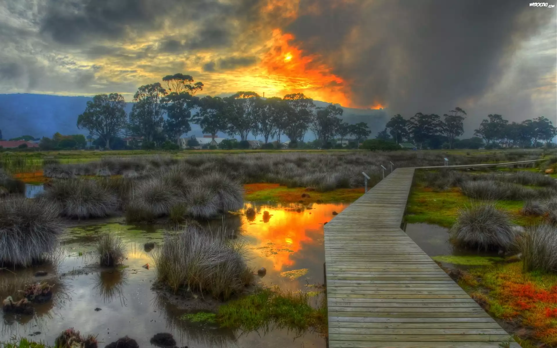 Zdjęcia, Kładka, Przez, Bagno, Zachodzące, Słońce