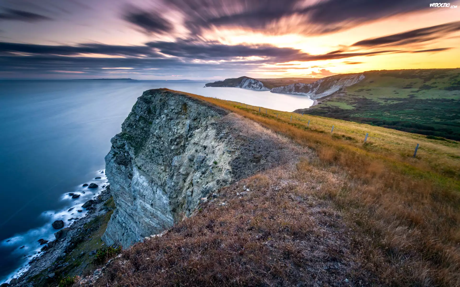 Zdjęcia, Wybrzeże, Klif, Morze, Zachód słońca, Trawy, Chmury