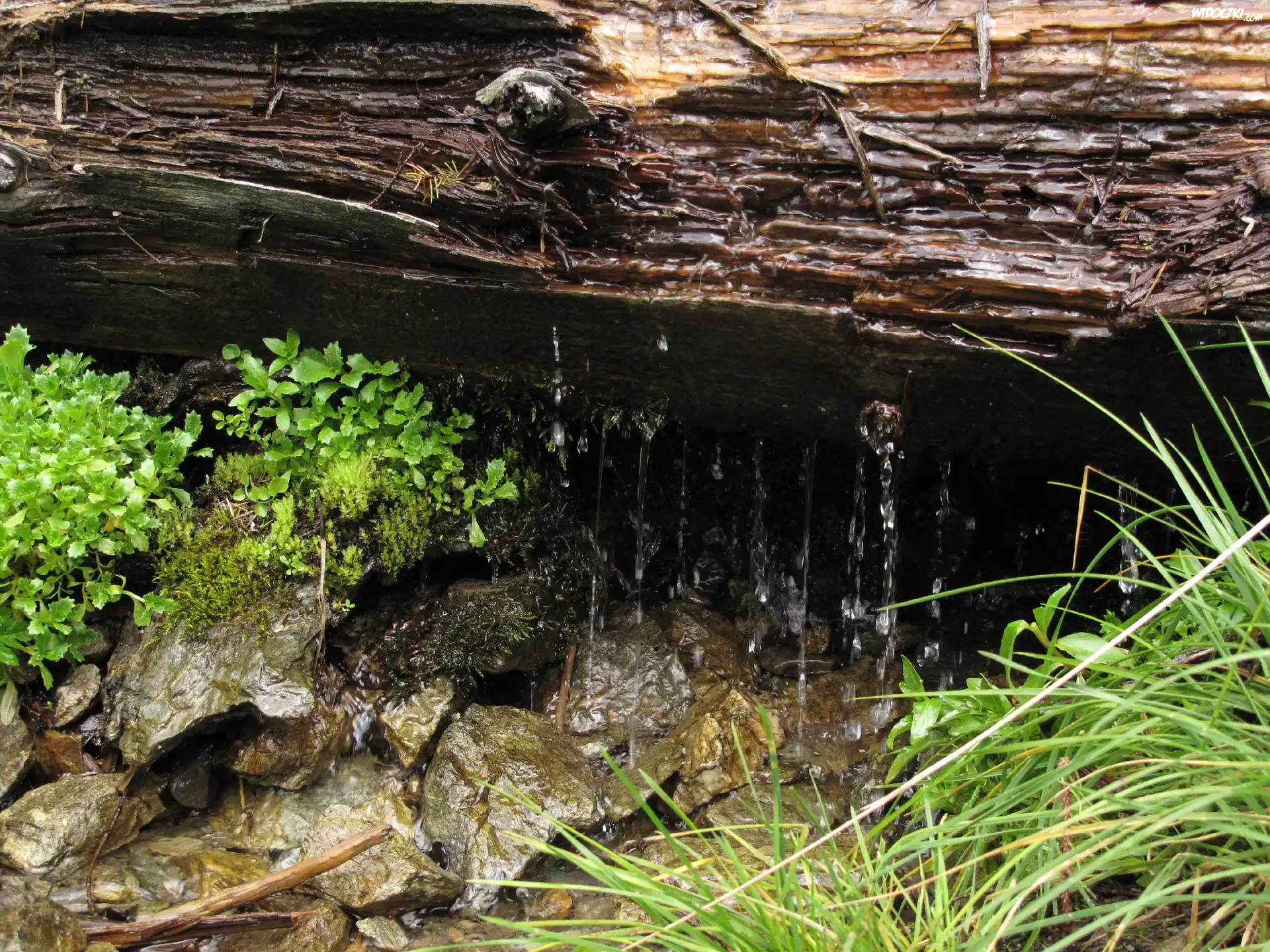 Kłoda, Woda, Skały, Trawa