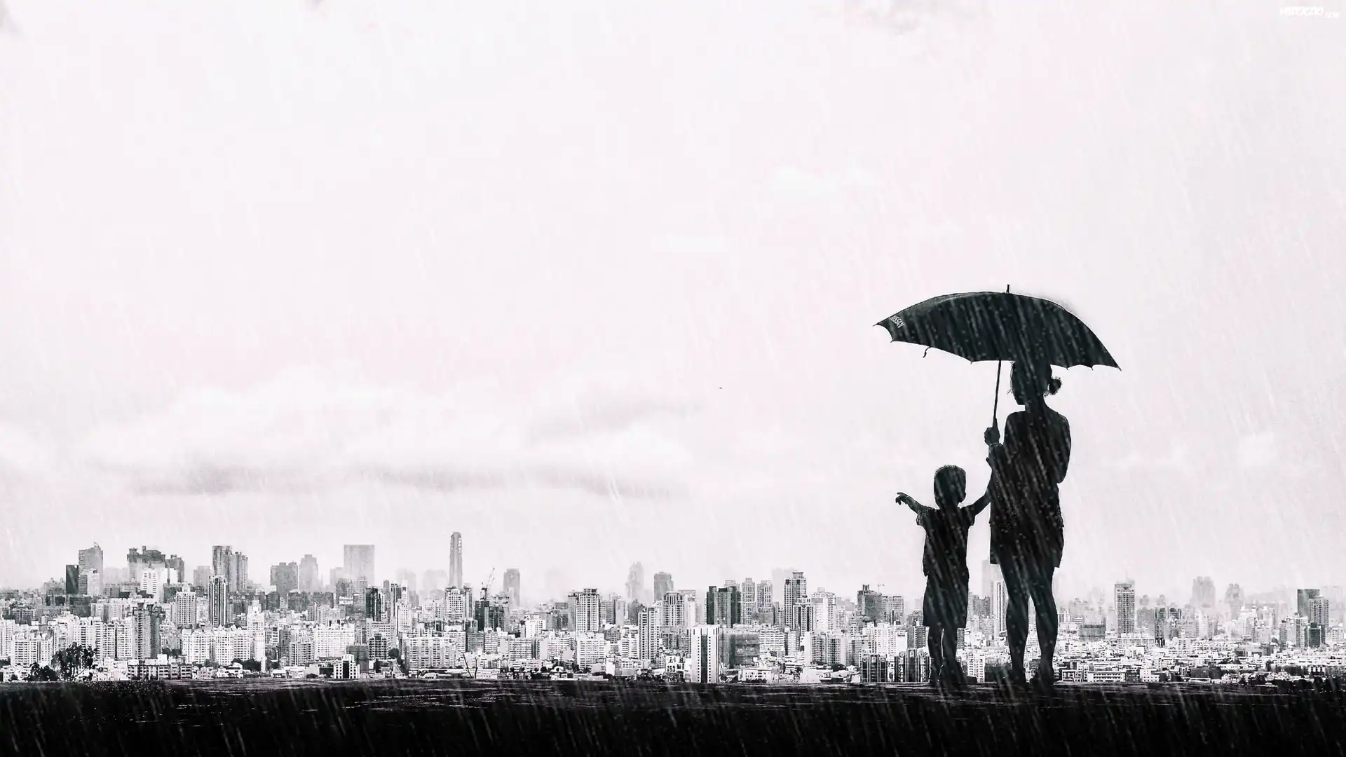 Zdjęcia, Grafika, Kobieta, Dziecko, Parasol, Deszcz, Miasto, Czarno białe