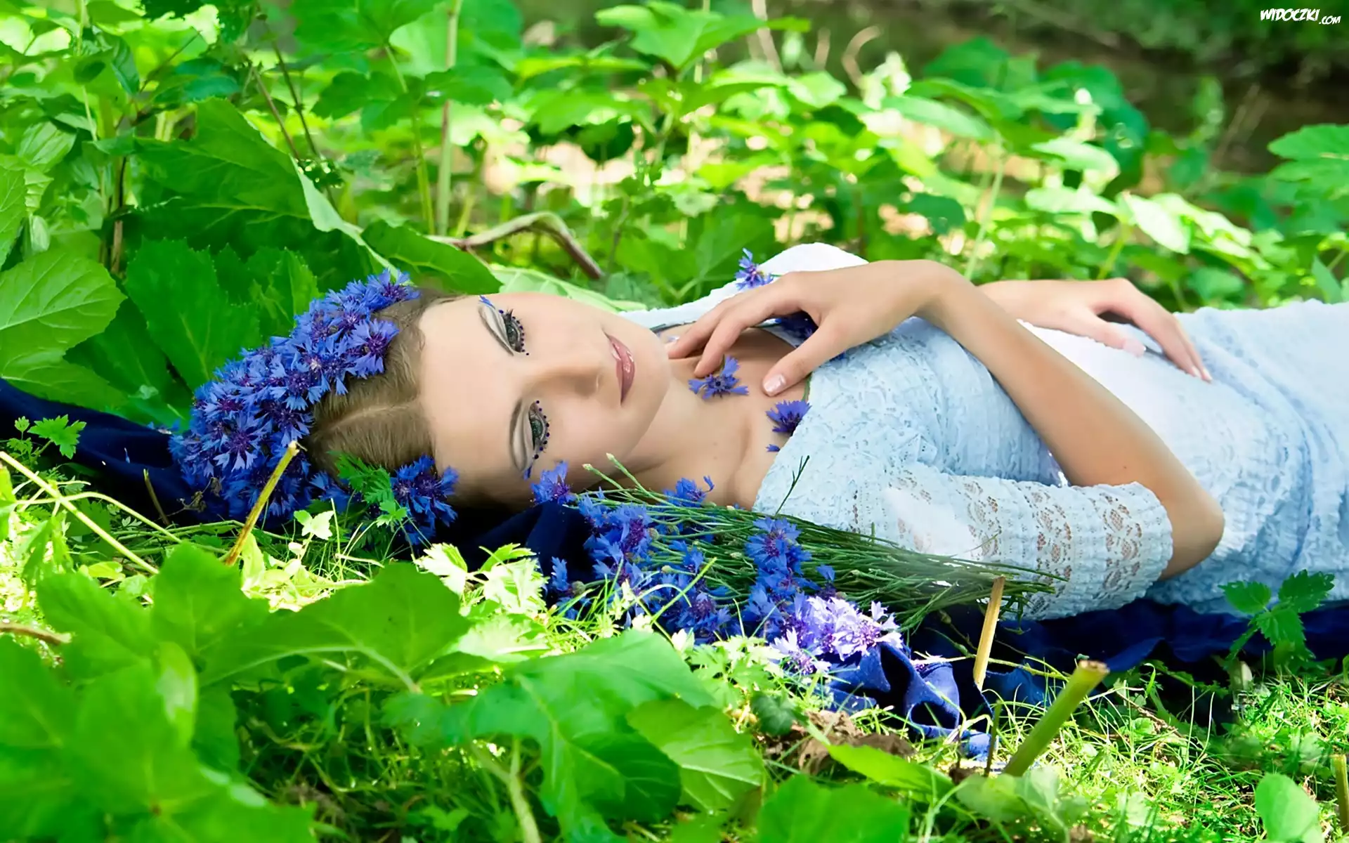 Łąka, Chabry, Piękna, Kobieta, Makijaż