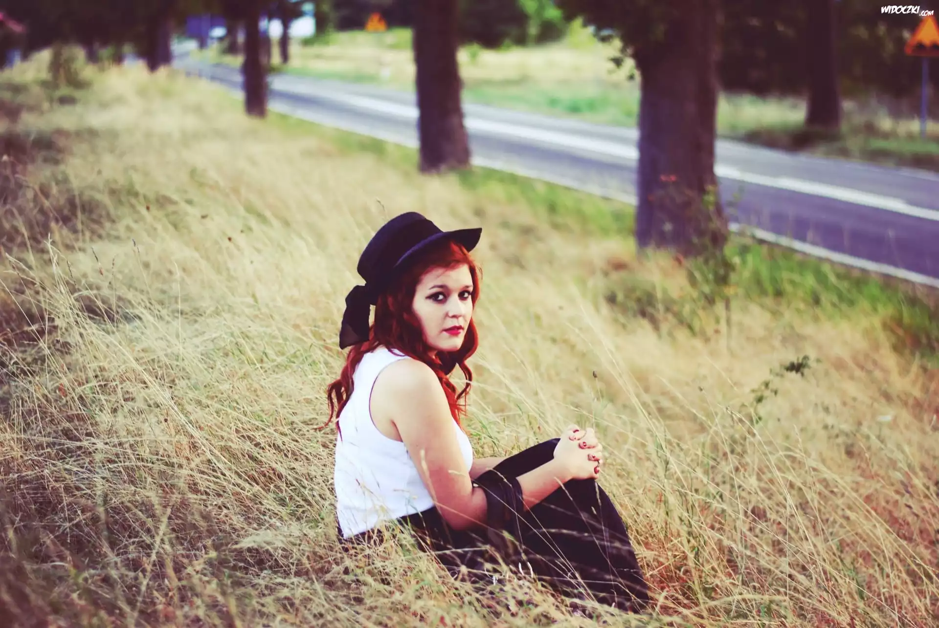 Kobieta, Ruda, Kapelusz, Droga, Pole