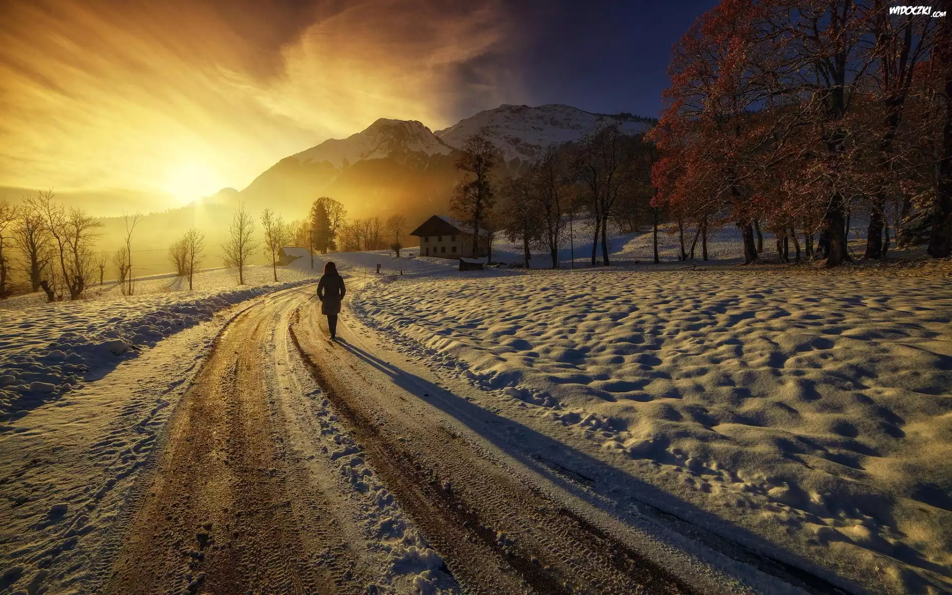 Zdjęcia, Droga, Kobieta, Dom, Góry, Zachód, Słońca, Zima