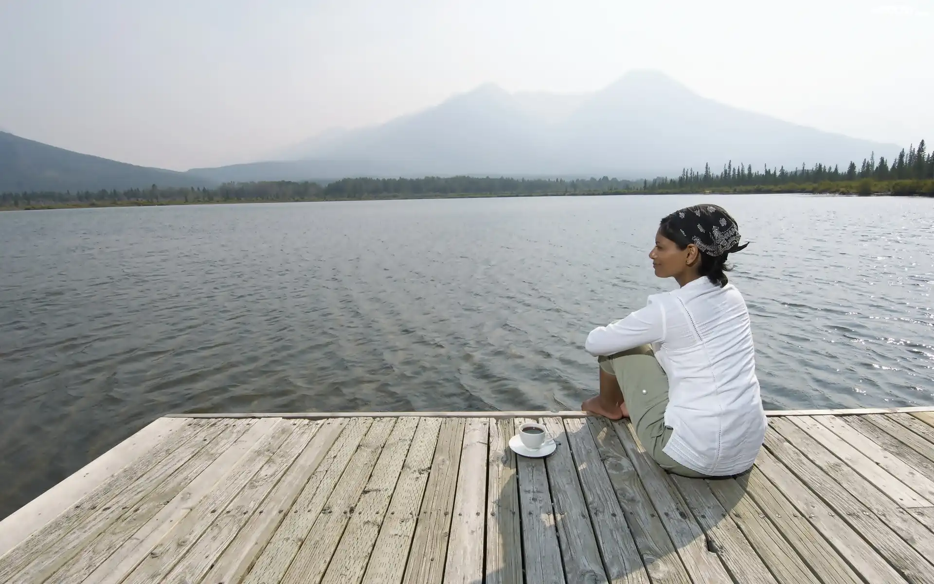 Kobieta, Pomost, Jezioro, Filiżanka, Kawa