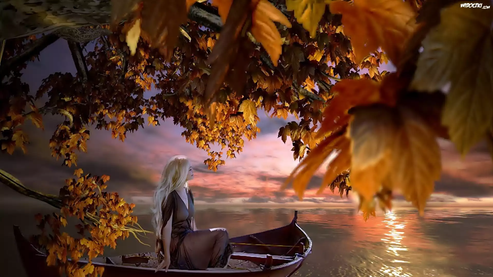 Zdjęcia, Kobieta, Łódka, Jezioro, Drzewa, Jesień, Grafika