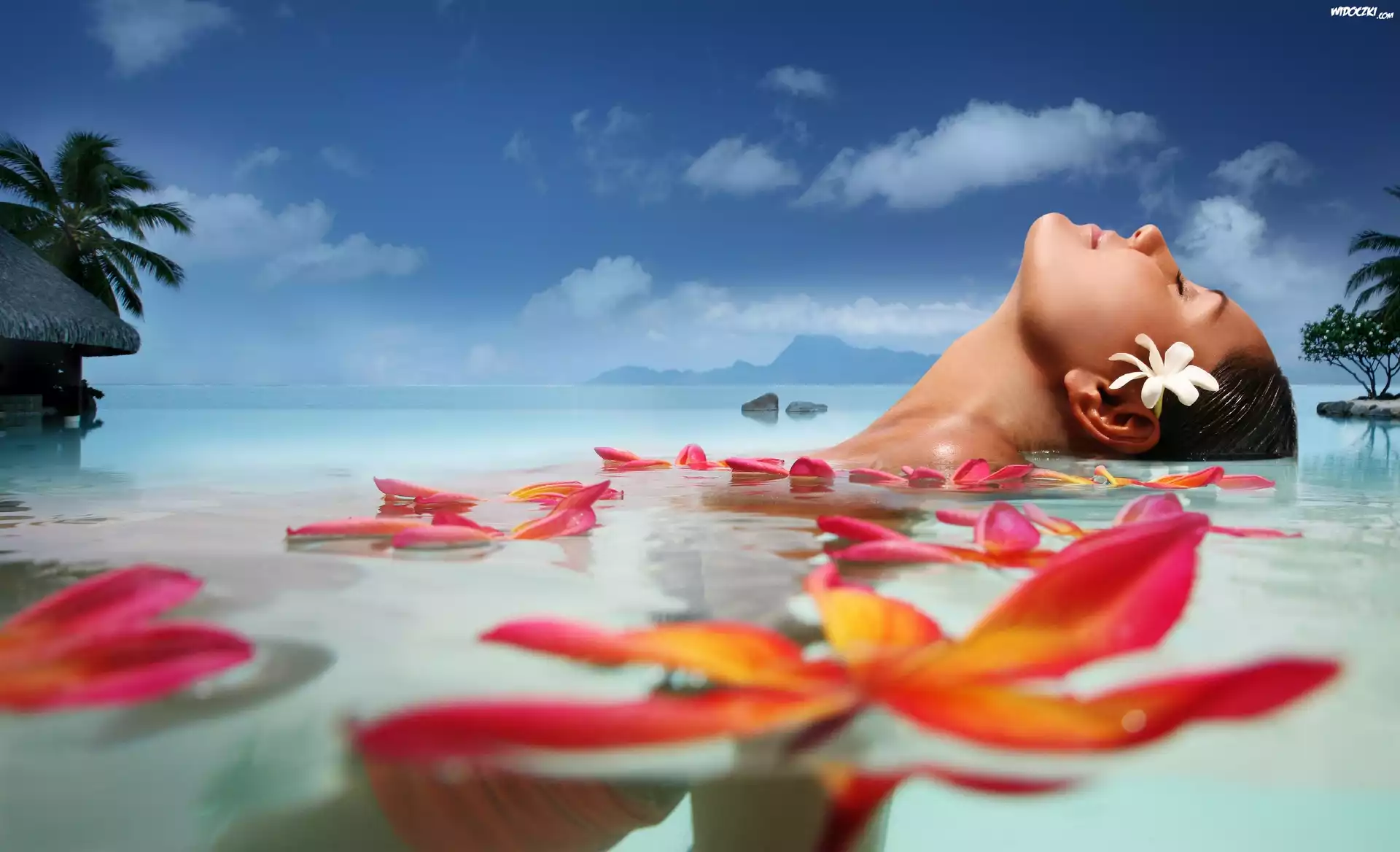 Zdjęcia, Kobieta, Kwiaty, Morze, Kąpiel, Tahiti
