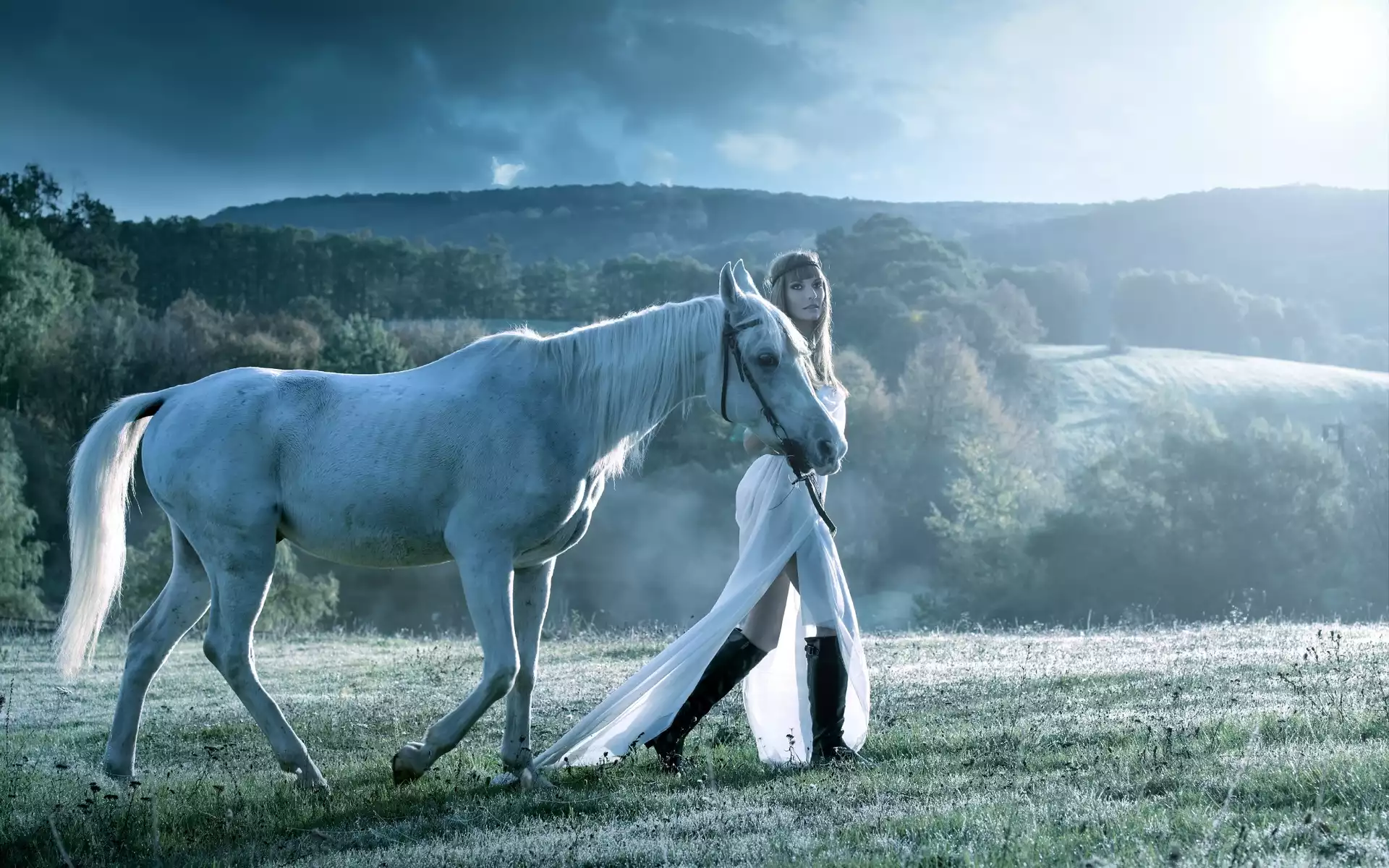 Zdjęcia, Koń, Kobieta, Łąka, Mgła, Góry, Lasy, Poranek