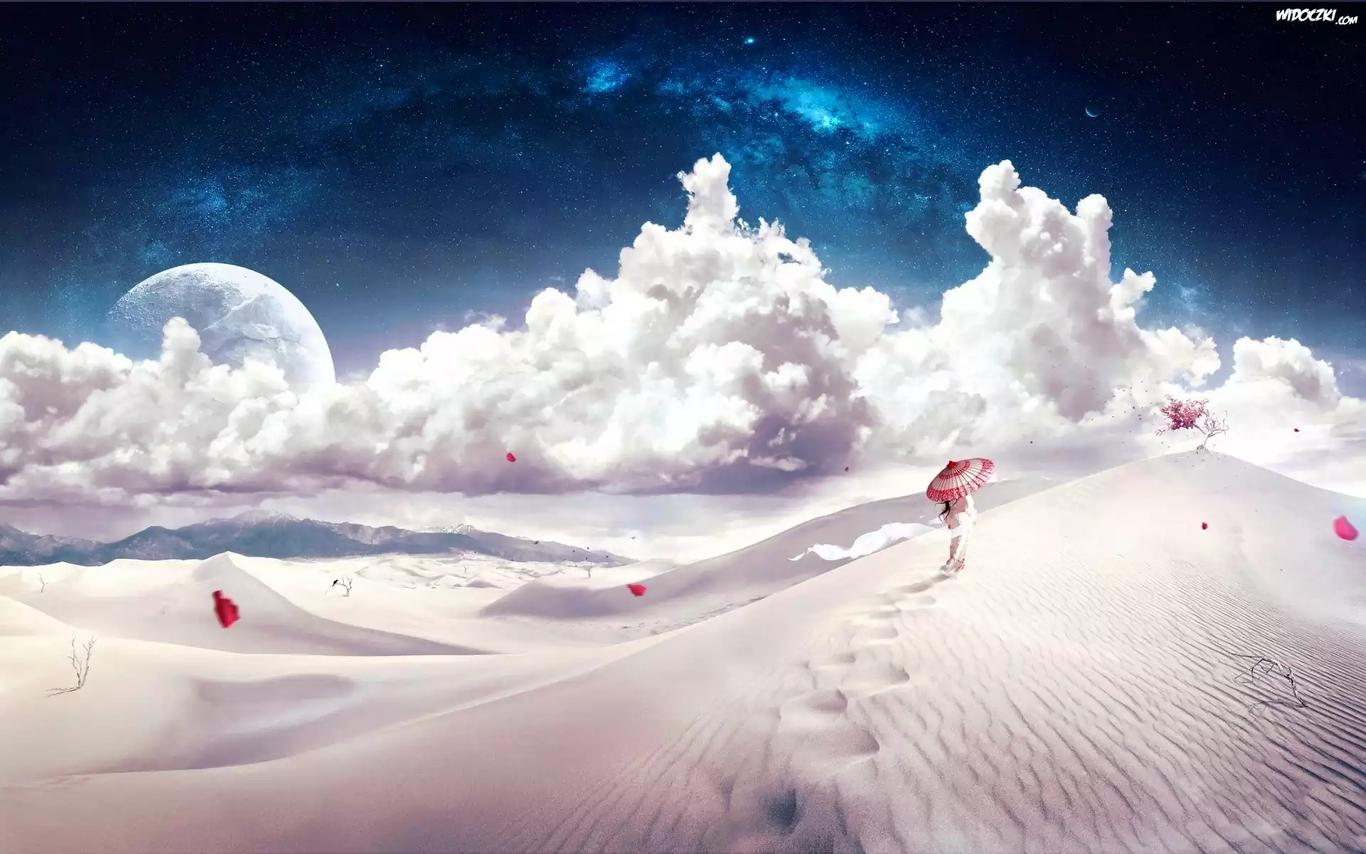 Zdjęcia, fantasy, Kobieta, Japonka, Parasolka, Wydmy, Pustynia, Chmury, Księżyc