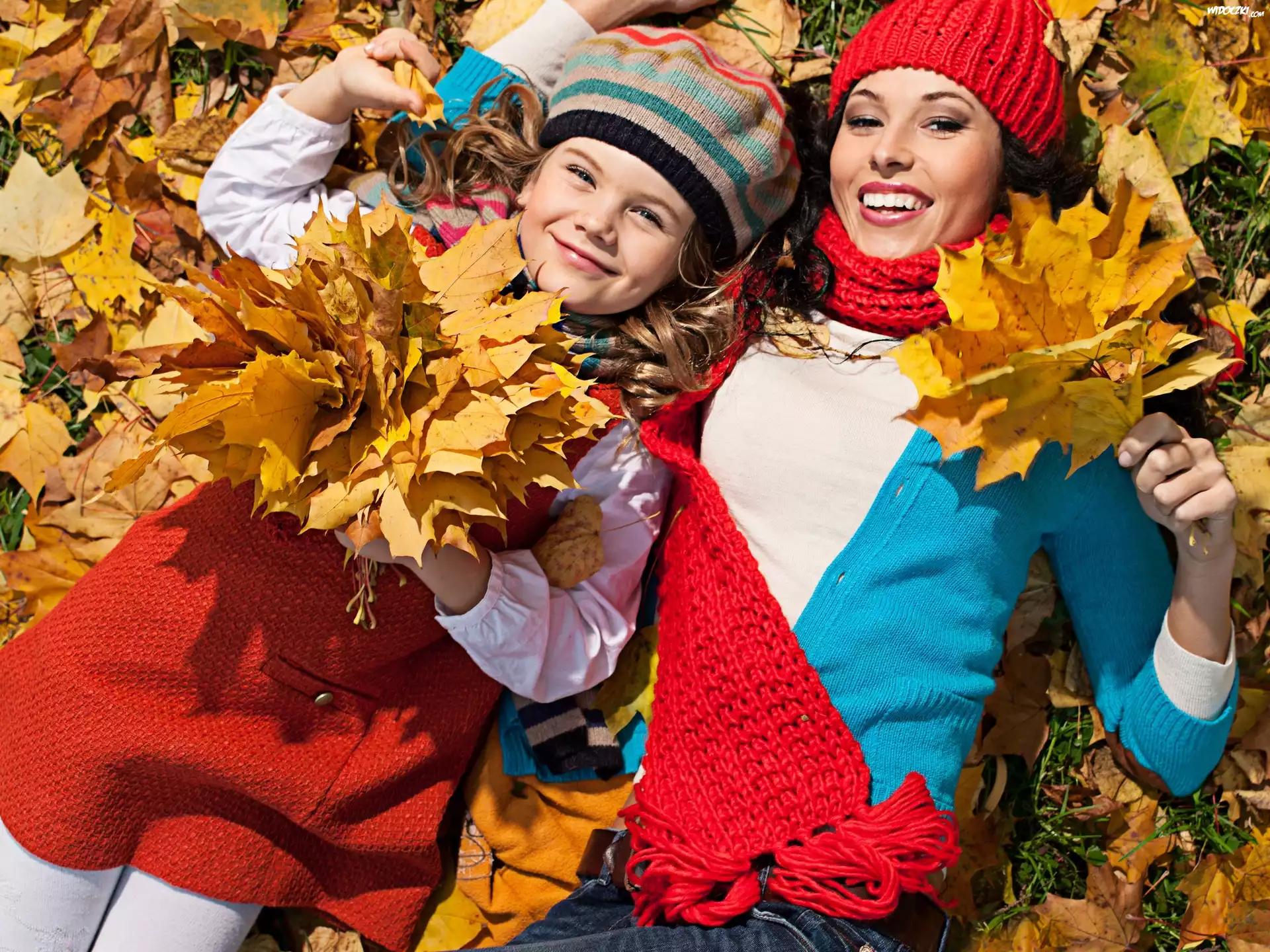 Zdjęcia, Kobieta, Dziewczynka, Liście, Jesień