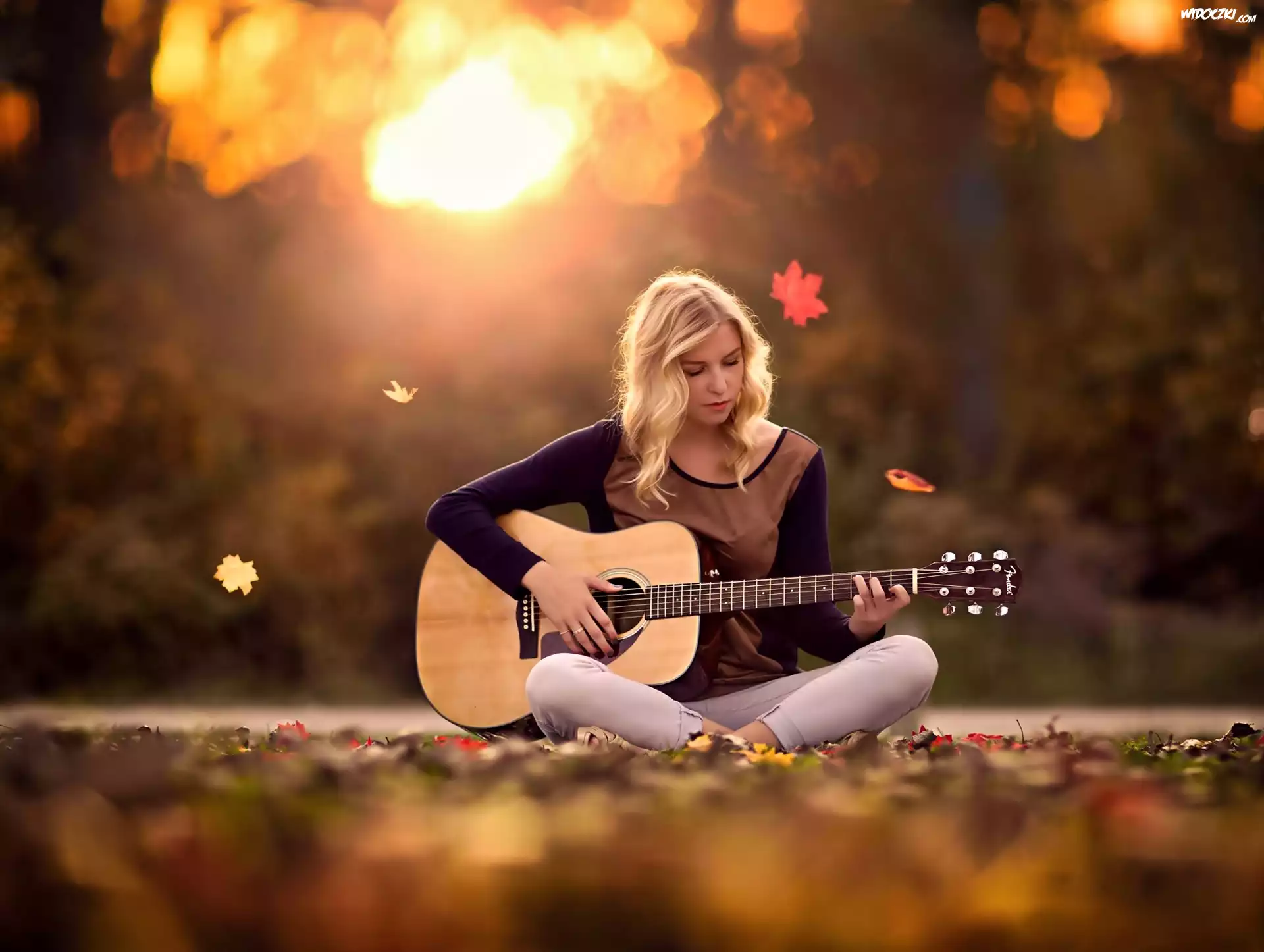 Zdjęcia, Kobieta, Jesień, Liście, Gitara