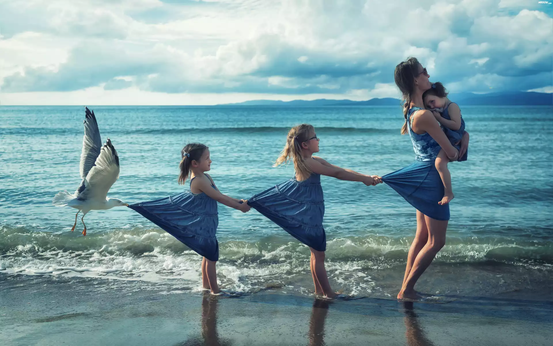 Kobieta, Dziewczynki, Mewa, Morze