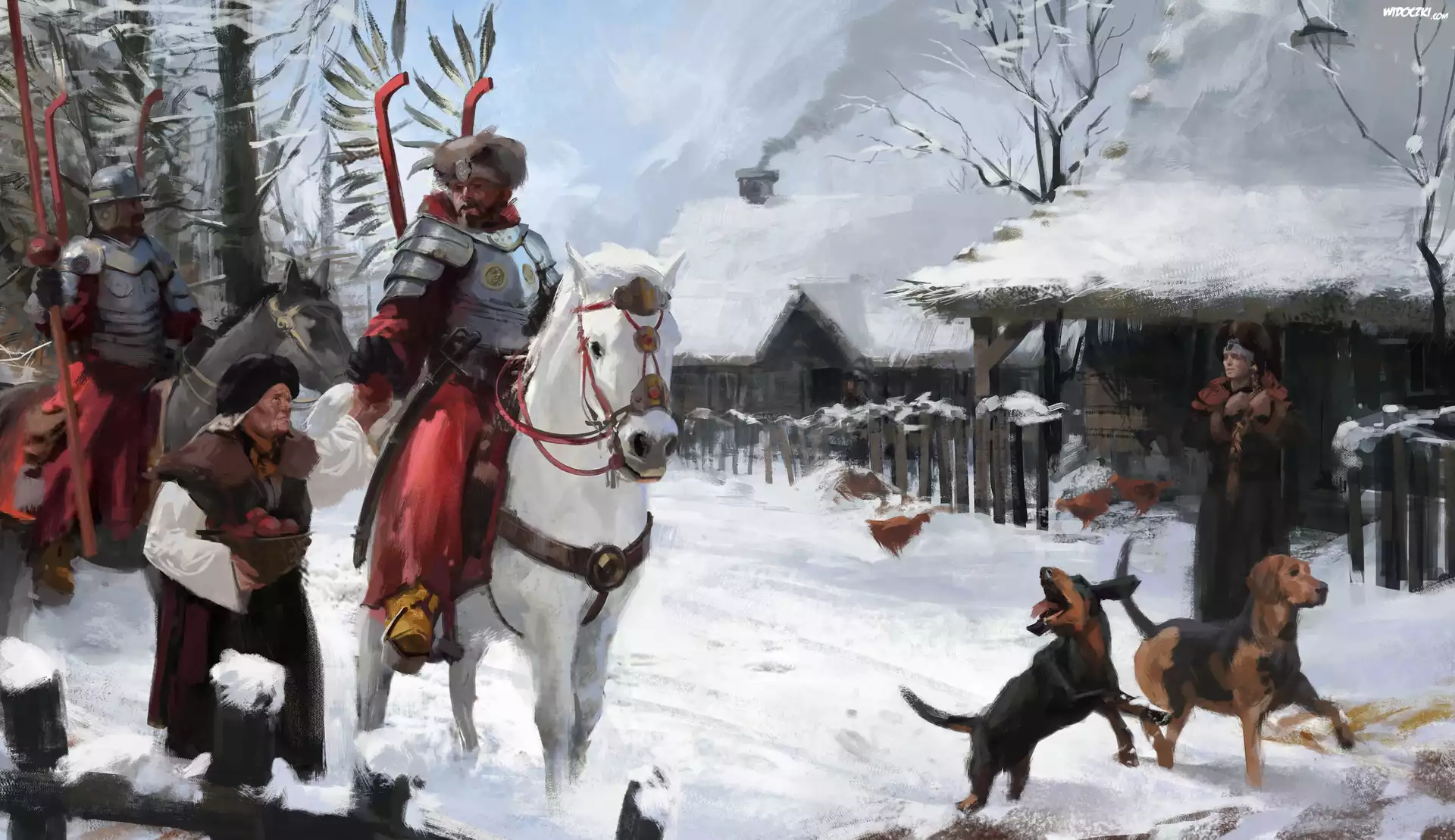 Grafika, Zima, Wieś, Jeźdźcy, Konie, Husaria, Kobieta, Mężczyzna, Chaty, Psy, Kury