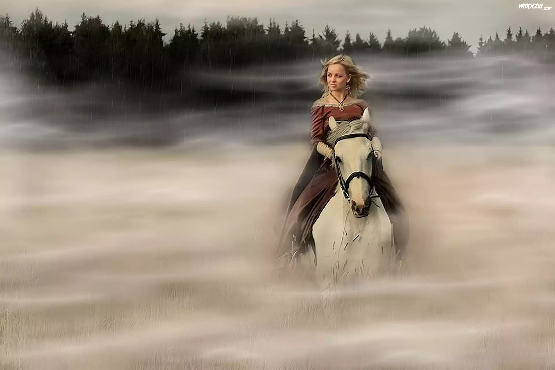 Zdjęcia, Kobieta, Koń, Mgła, Las