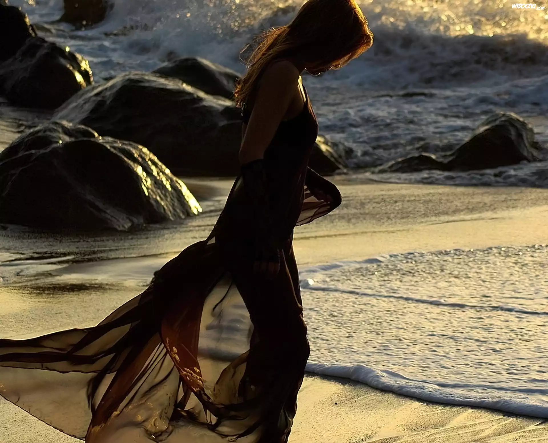 Zdjęcia, Kobieta, Plaża, Morze, Fale