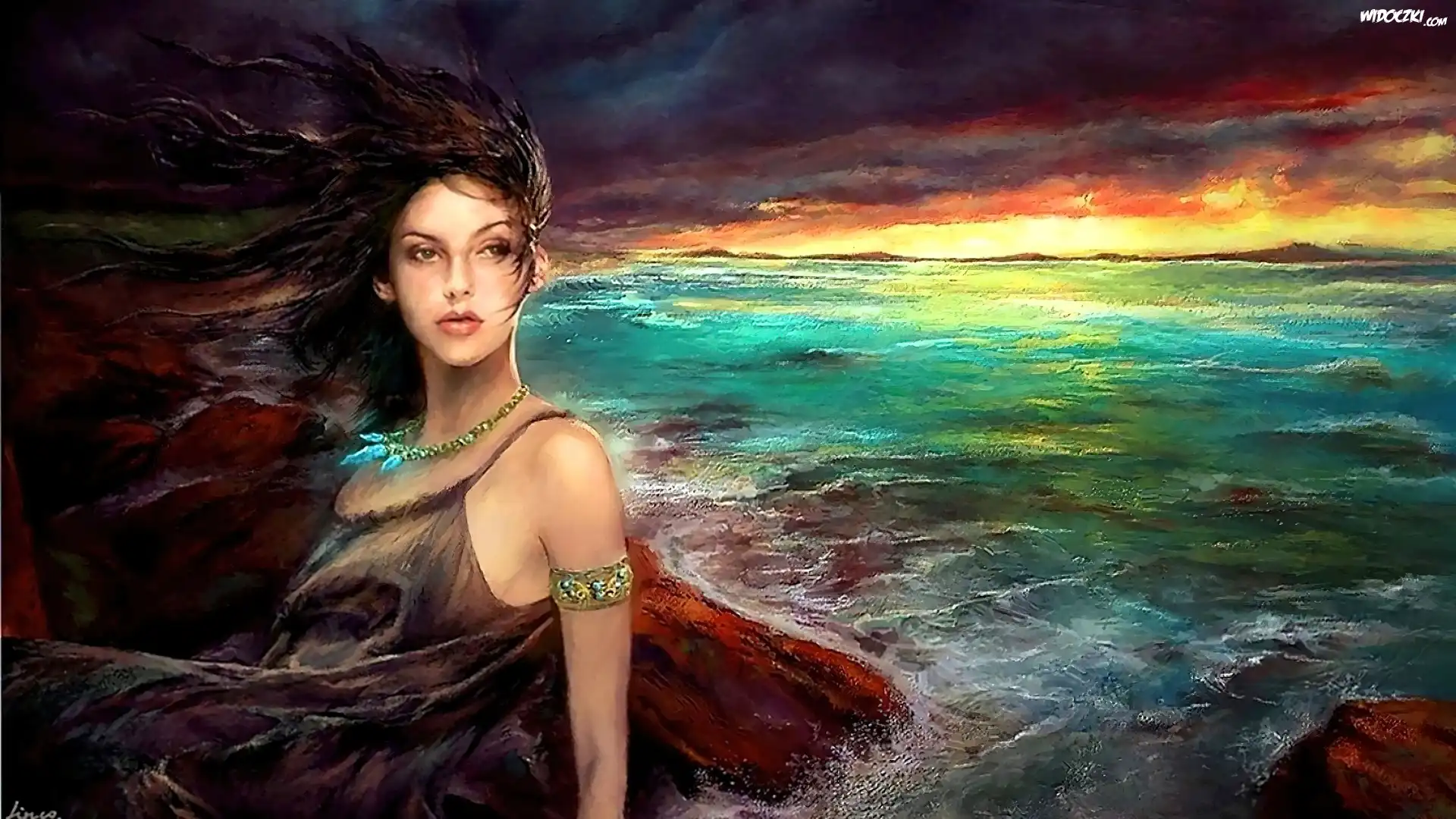 Zdjęcia, Kobieta, Zachód, Słońca, Morze, Art