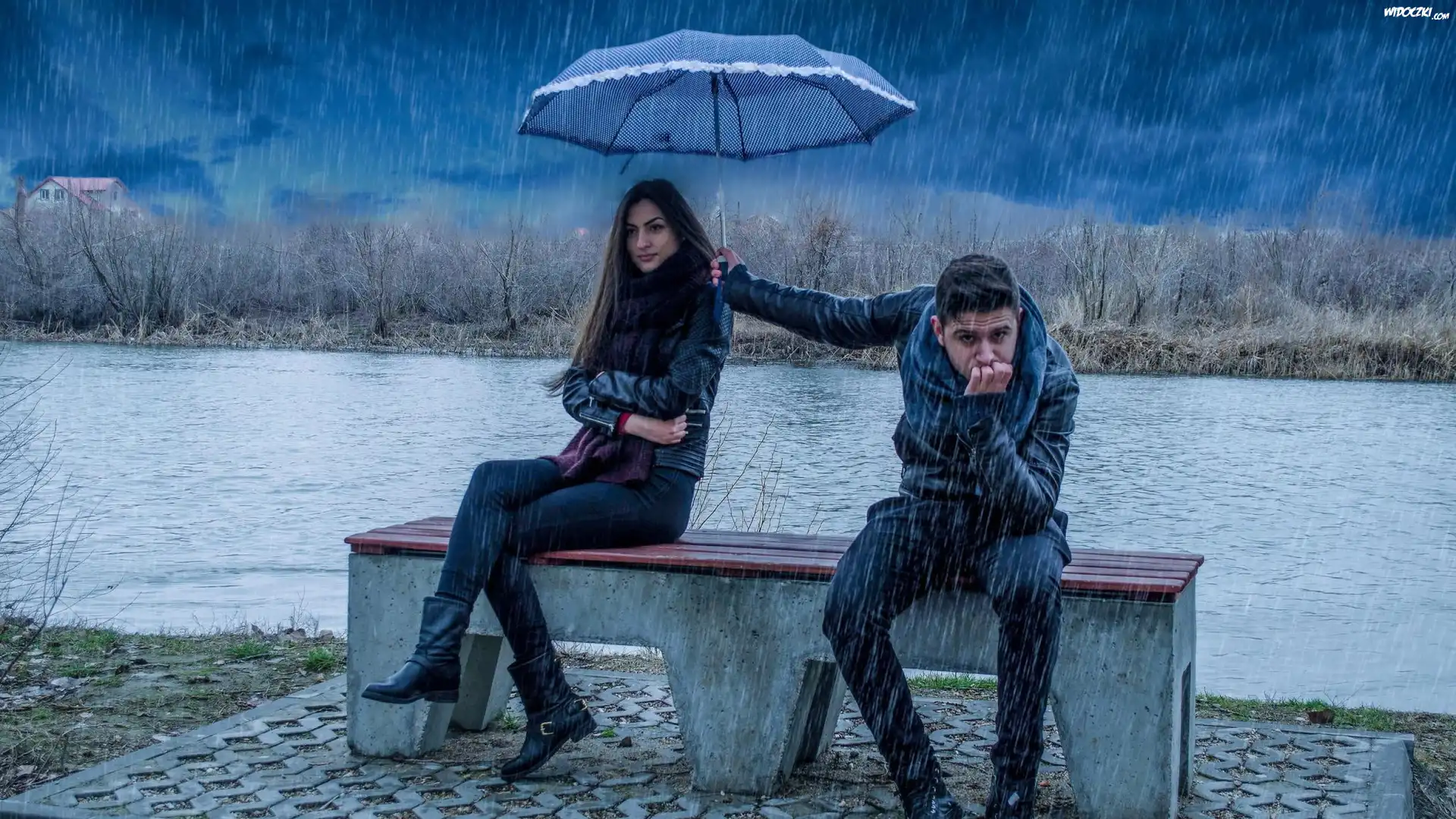 Zdjęcia, Kobieta, Mężczyzna, Deszcz, Parasol, Ławka