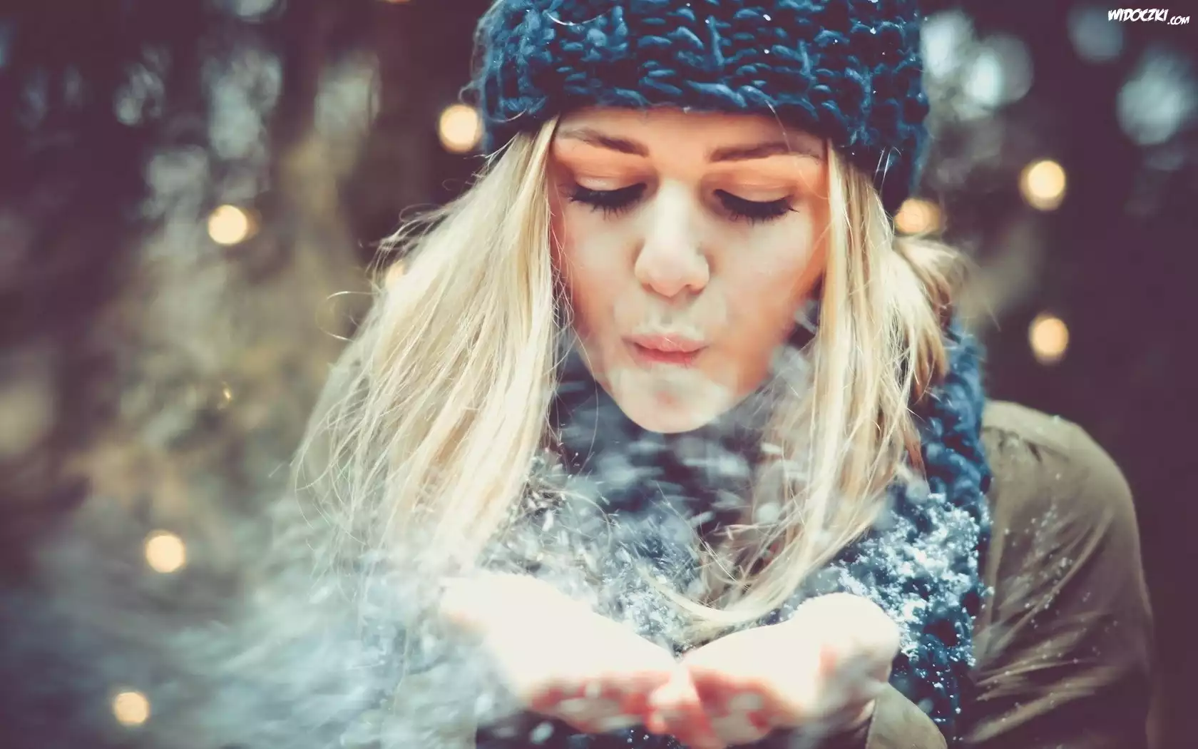 Zdjęcia, Piękna, Kobieta, Blondynka, Śnieg, Ręce, Zimowa, Czapka