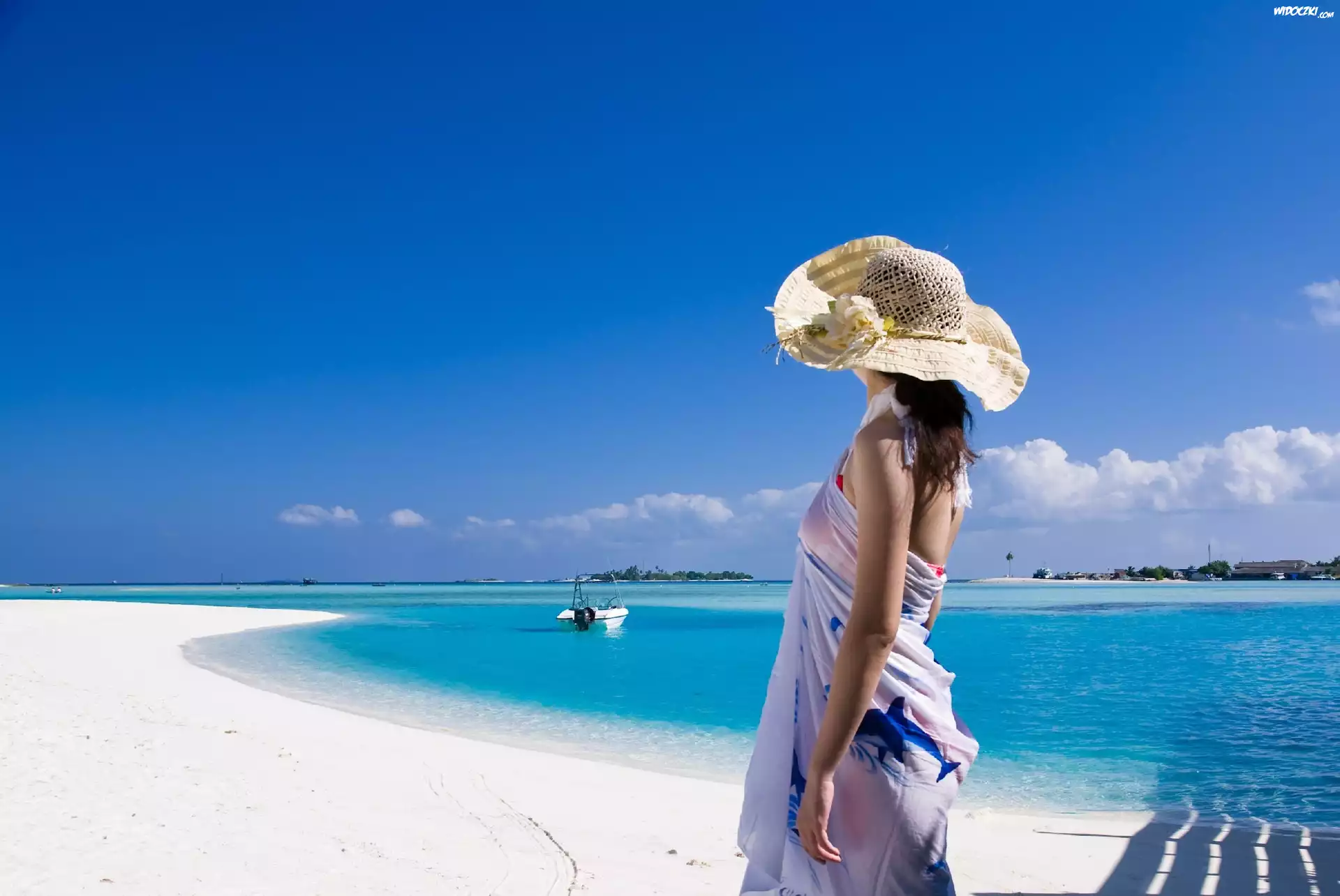 Zdjęcia, Plaża, Kobieta, Kapelusz