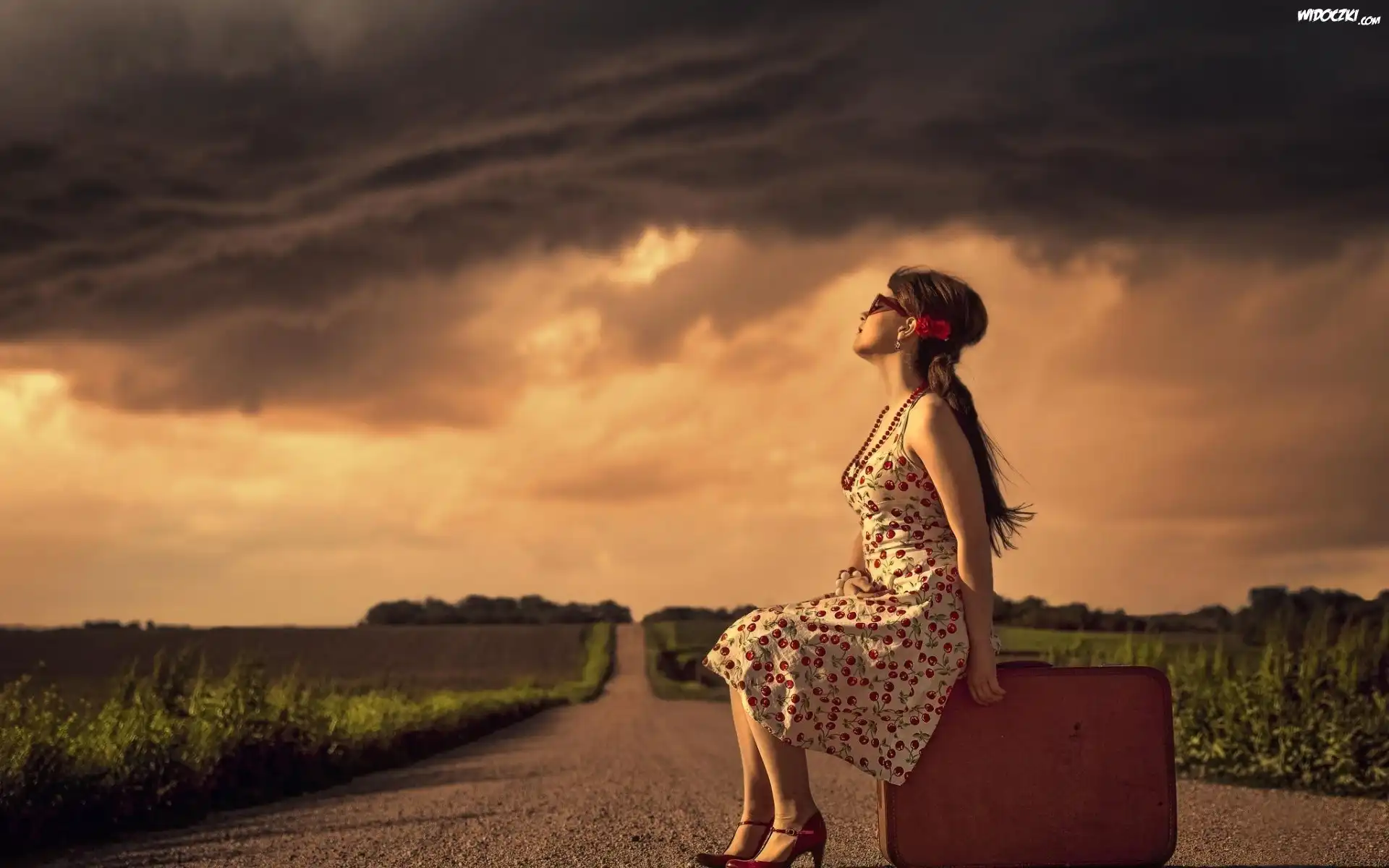 Zdjęcia, Kobieta, Biżuteria, Walizka, Droga, Pole, Chmury