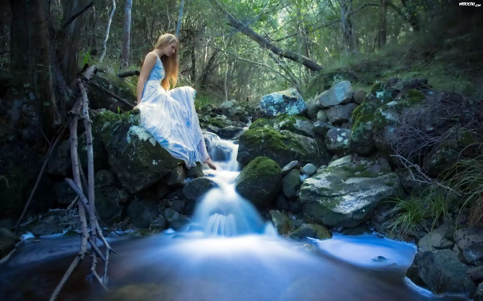 Zdjęcia, Kobieta, Las, Potok, Kamienie