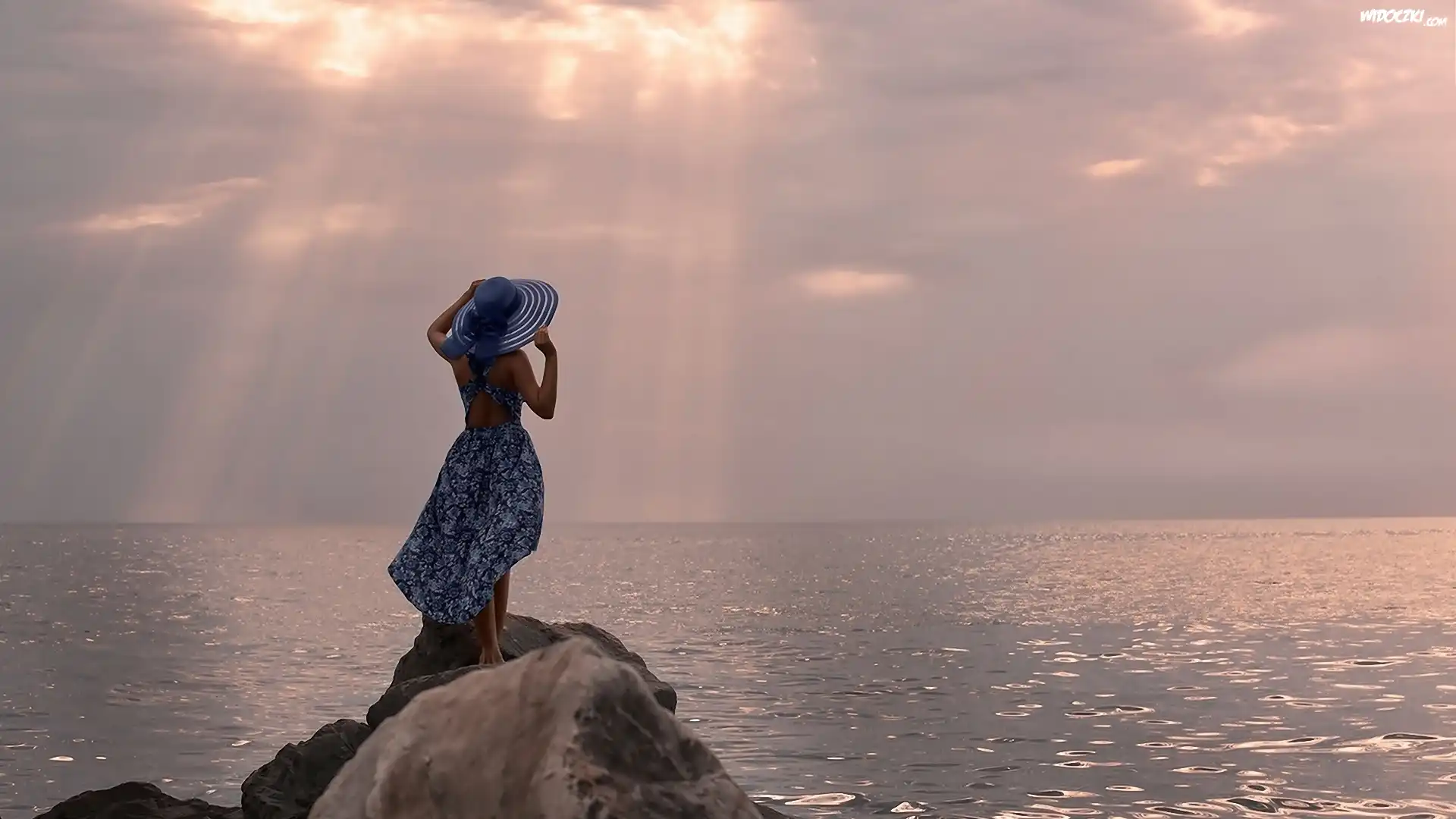Kobieta, Kapelusz, Morze, Skały, Przebijające światło