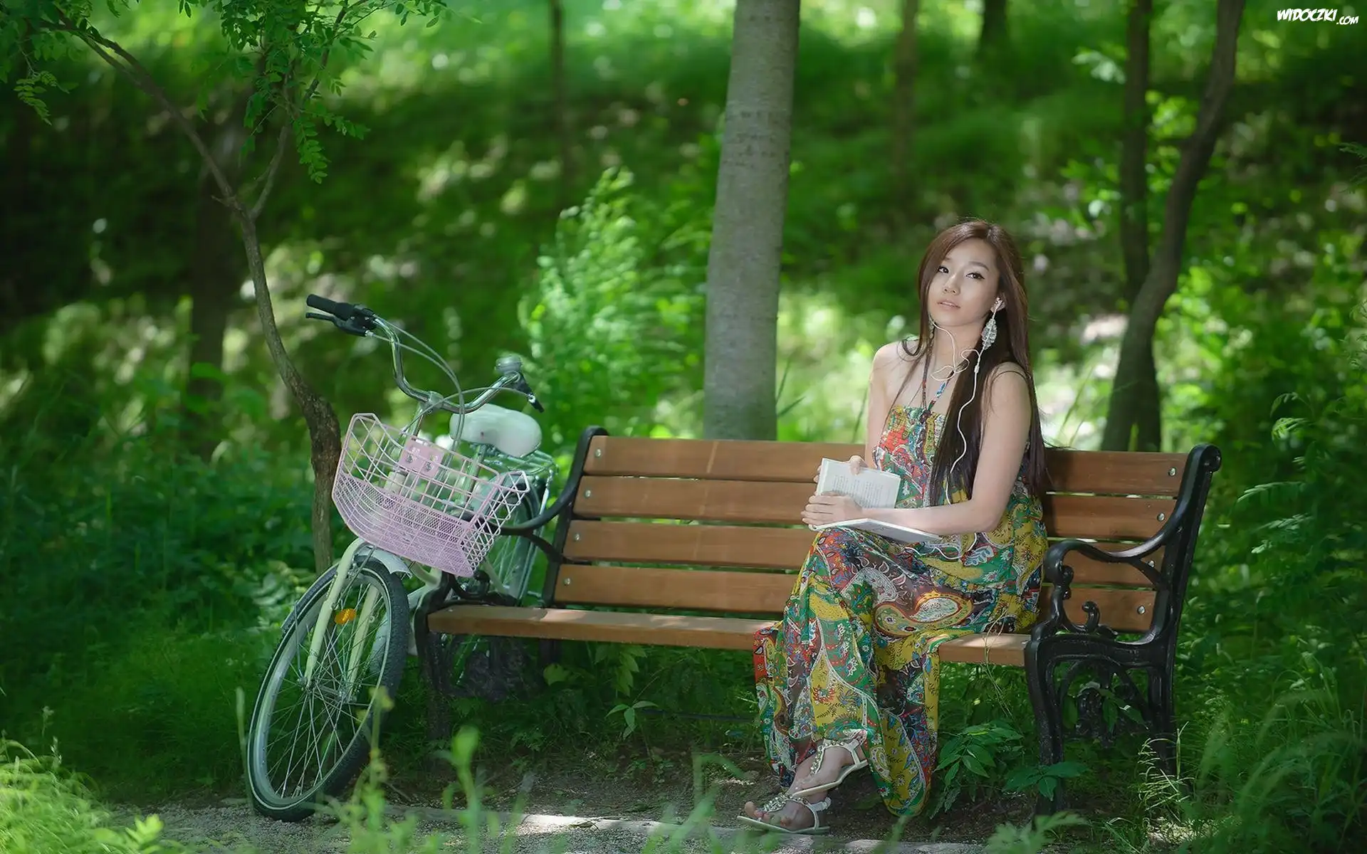 Zdjęcia, Kobieta, Szatynka, Słuchawki, Książka, Rower, Ławka