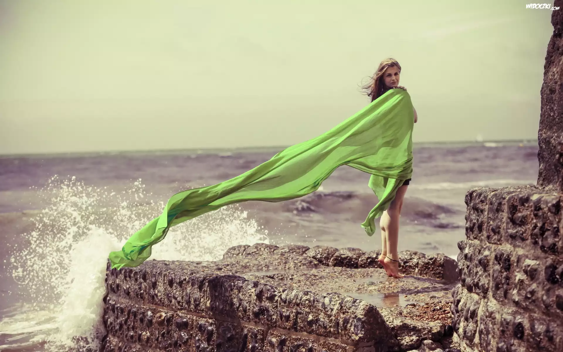 Zdjęcia, Kobieta, Zielony, Szal, Skały, Morze