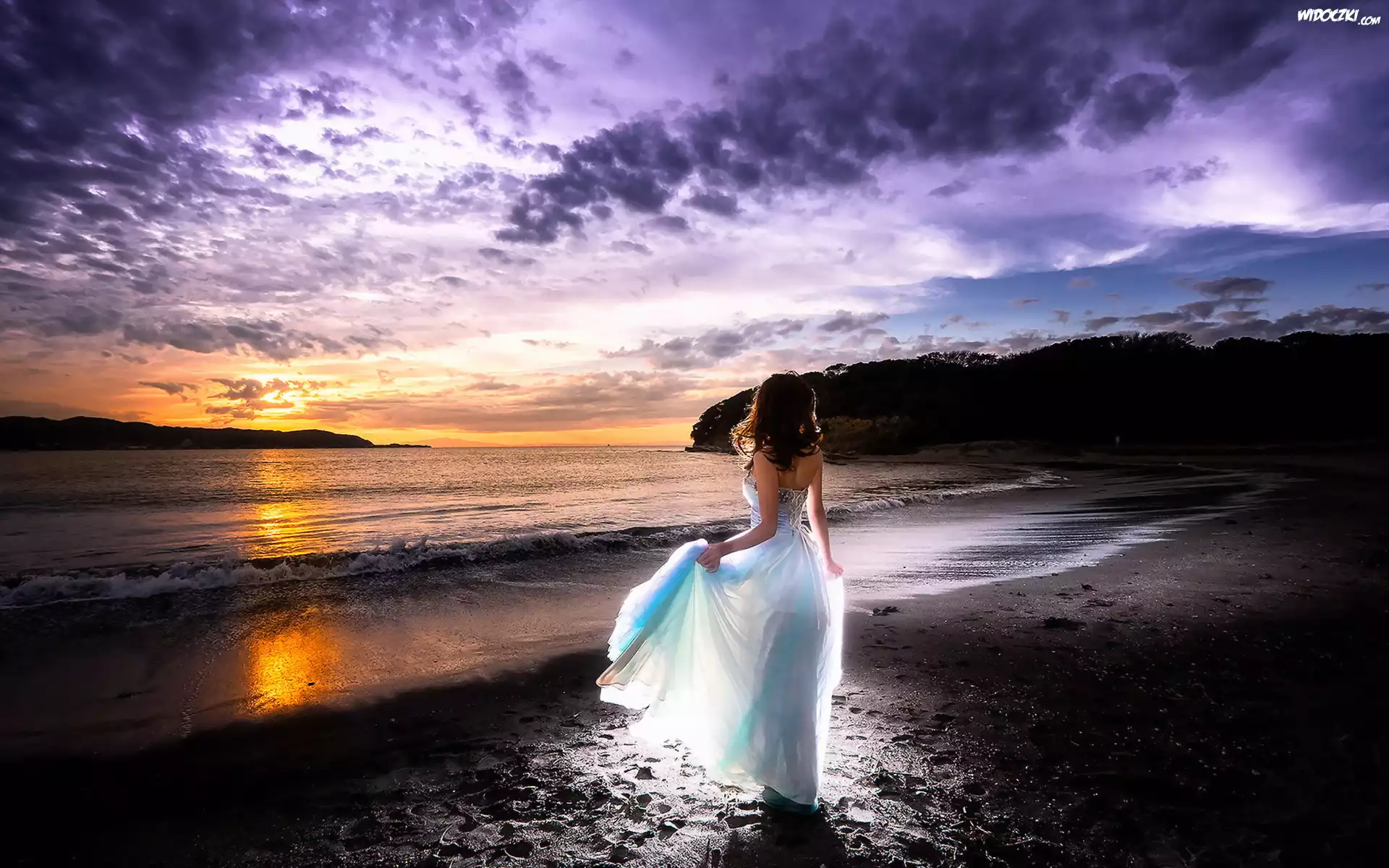 Zdjęcia, Kobieta, Zachód słońca, Morze