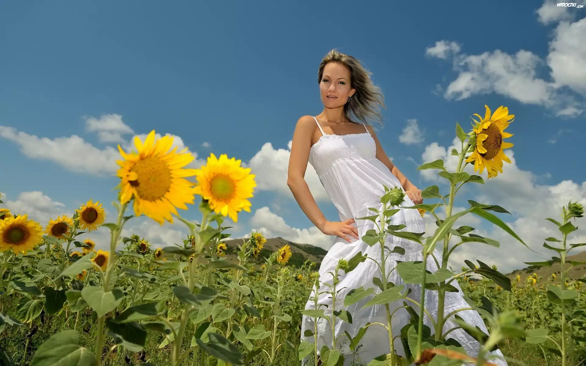Zdjęcia, Kobieta, Pole, Słoneczników, Chmury