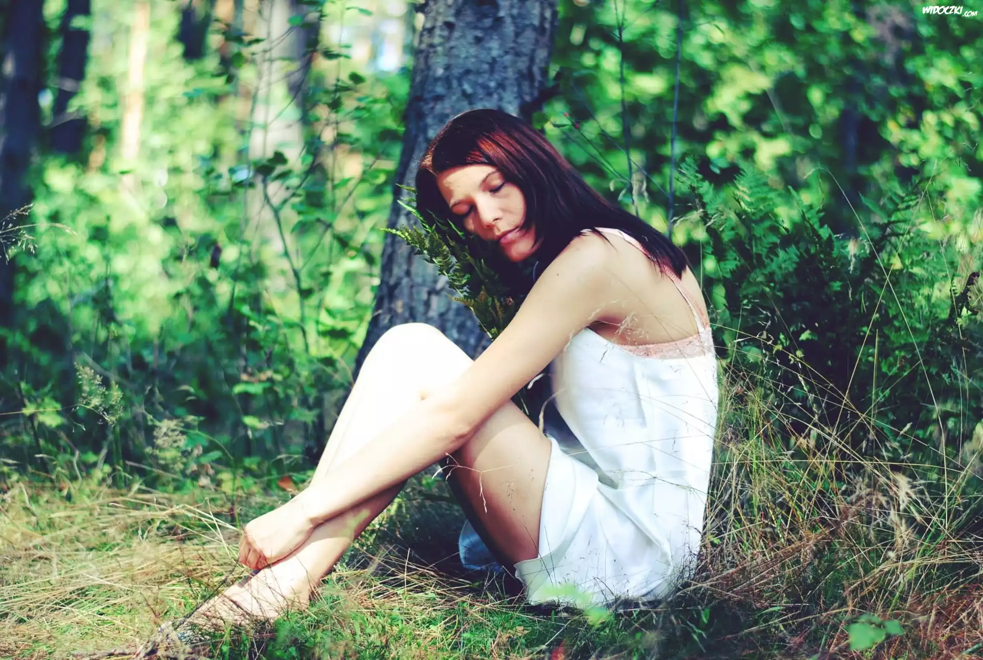 Kobieta, Szatynka, Biała, Sukienka, Las