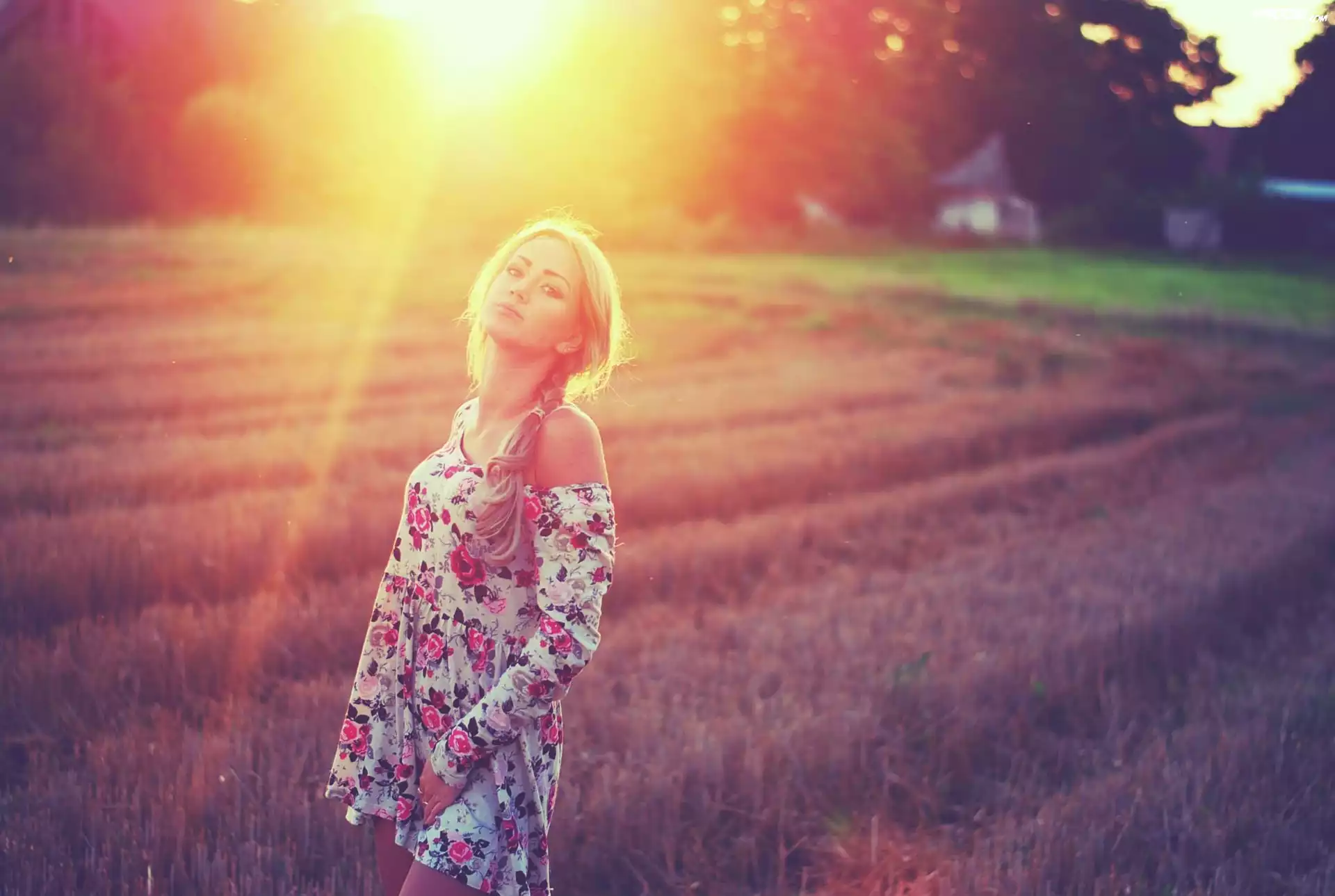 Kobieta, Blondynka, Sukienka, Pole, Lawenda wÄ…skolistna