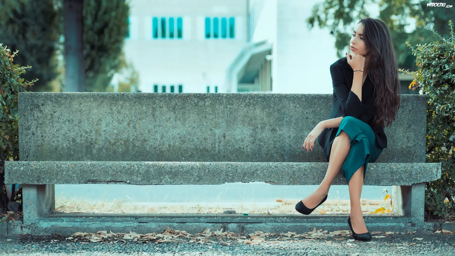 Zdjęcia, Kobieta, Długowłosa, Szatynka, Ławka