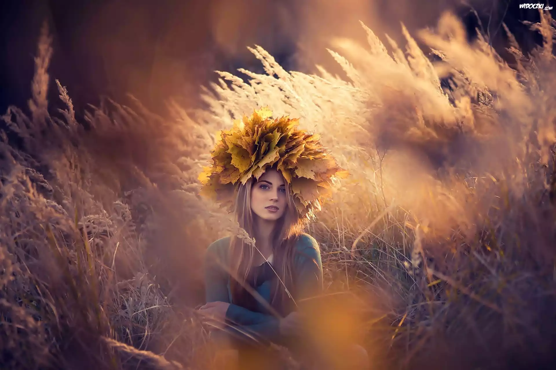Jesień, Kobieta, Twarz, Wianek, Liście, Klonu, Suche, Trawy