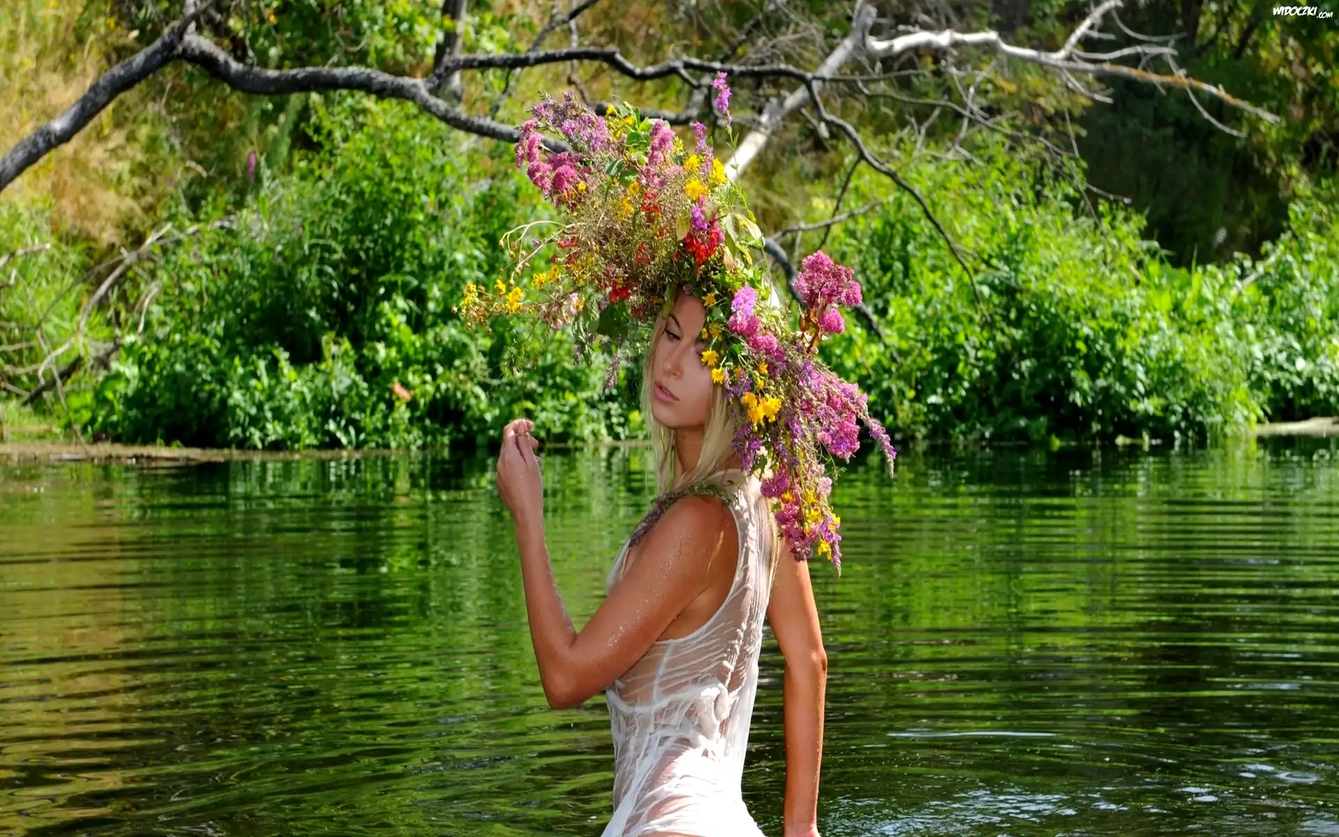 Zdjęcia, Kobieta, Wiosenny, Wianek, Jezioro