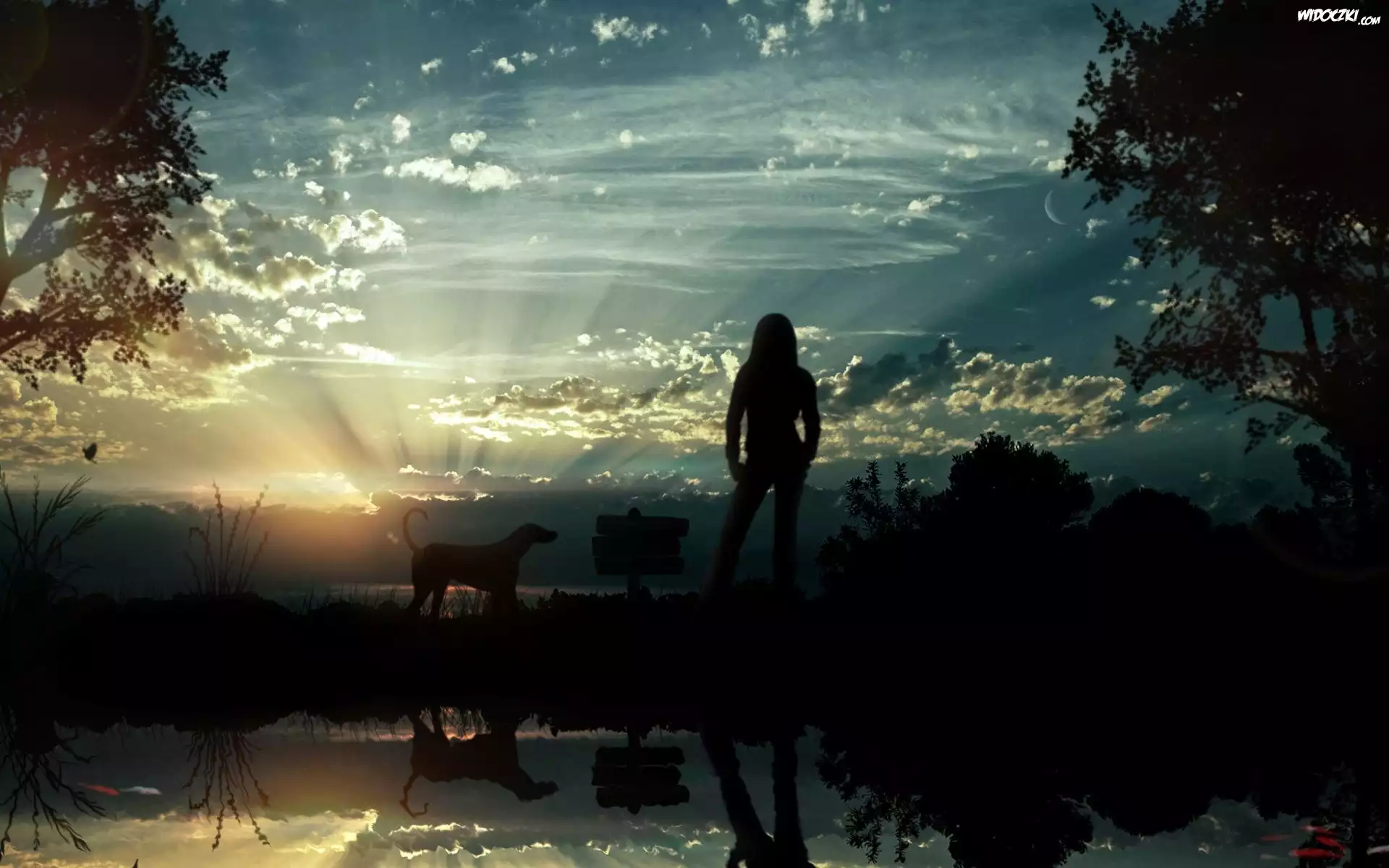 Kobieta, Natura, Pies, Promienie, Światła, Niebo