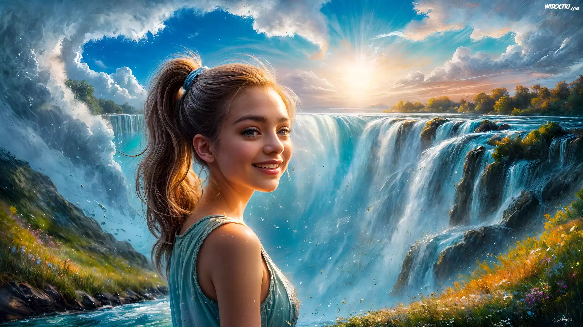 Grafika, Kobieta, Wodospad, Promienie słońca