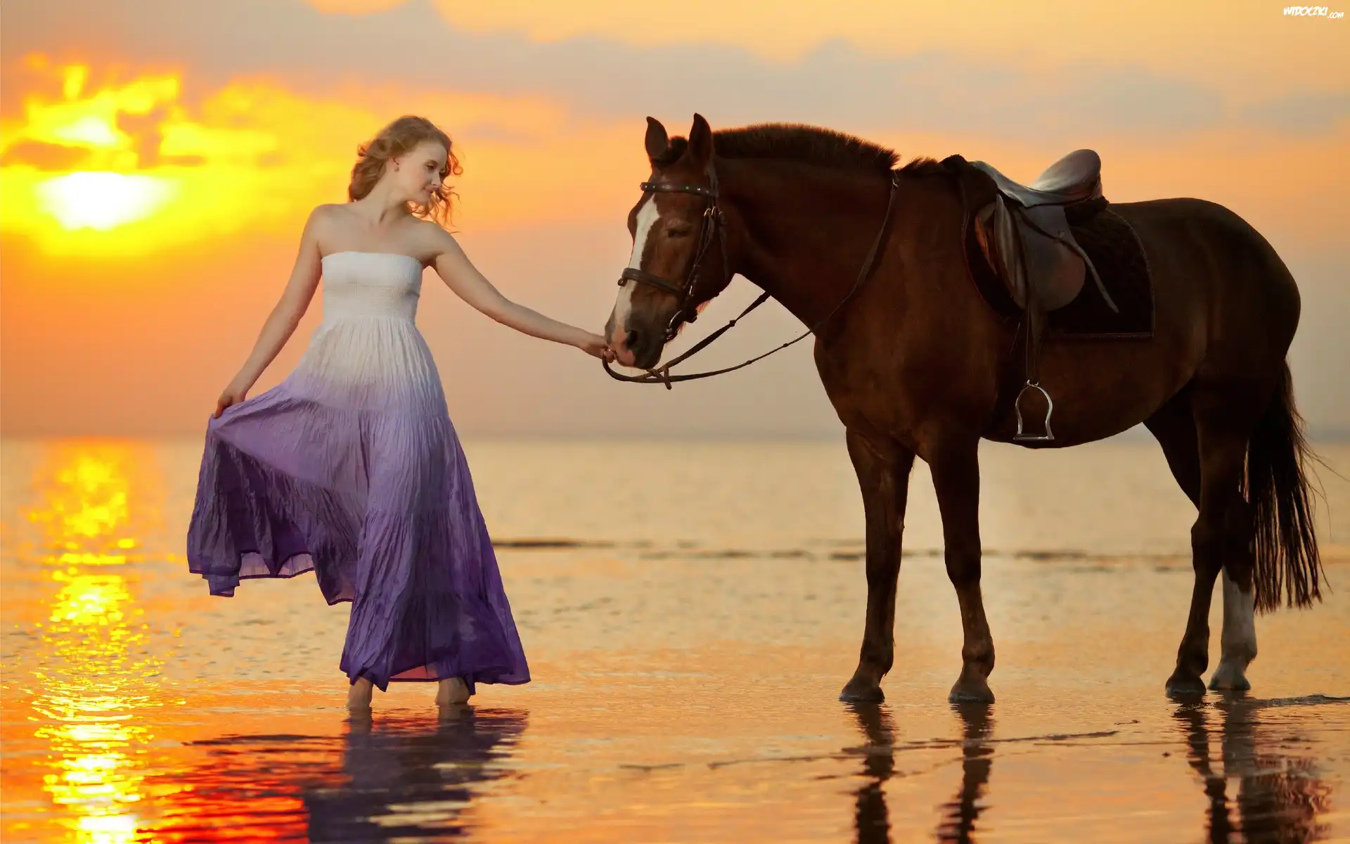 Zdjęcia, Kobieta, Sukienka, Koń, Morze, Zachód, Słońca