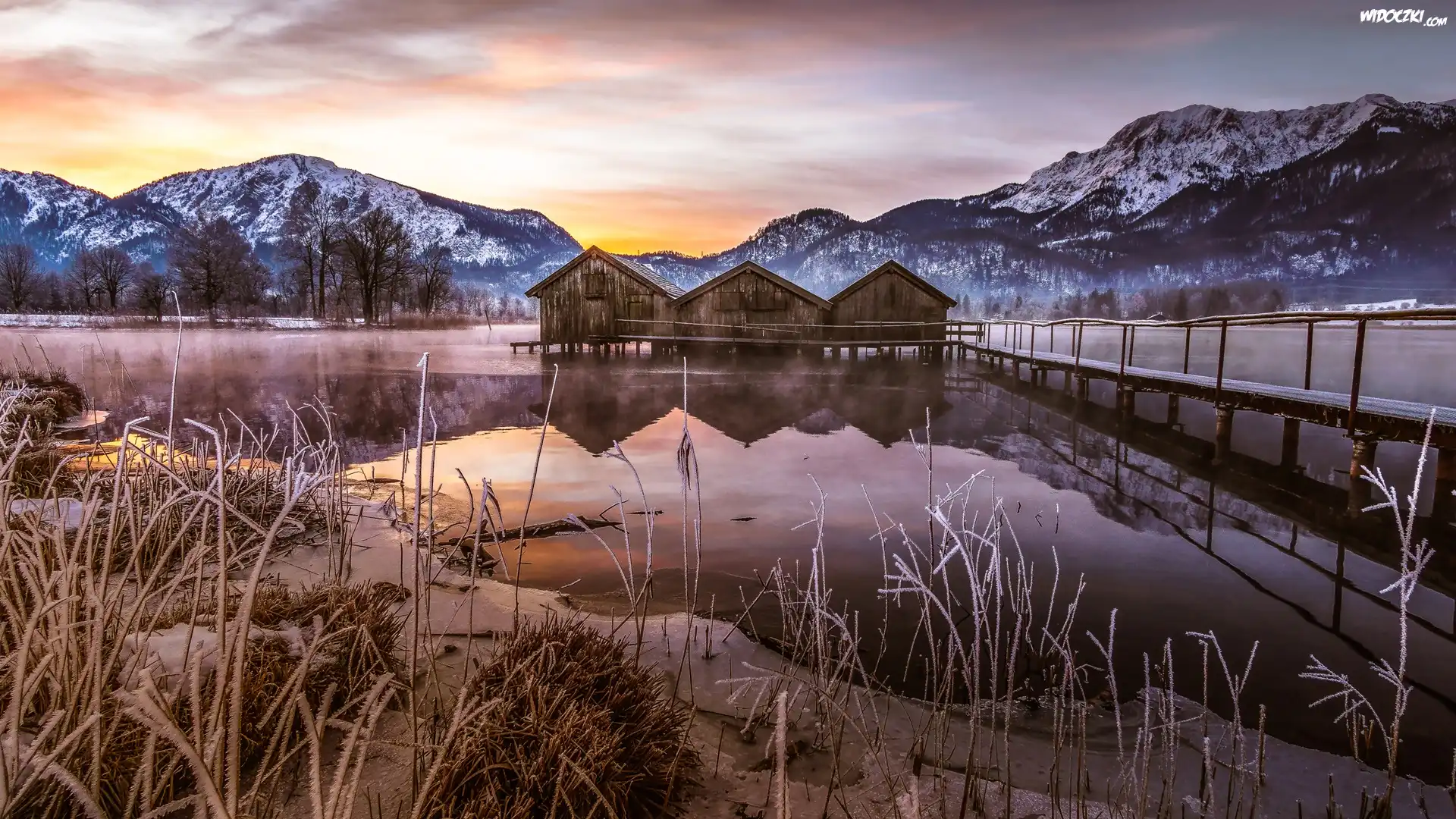 Zdjęcia, Schlehdorf, Jezioro Kochelsee, Góry, Drzewa, Pomost, Domki, Wschód słońca, Bawaria, Niemcy