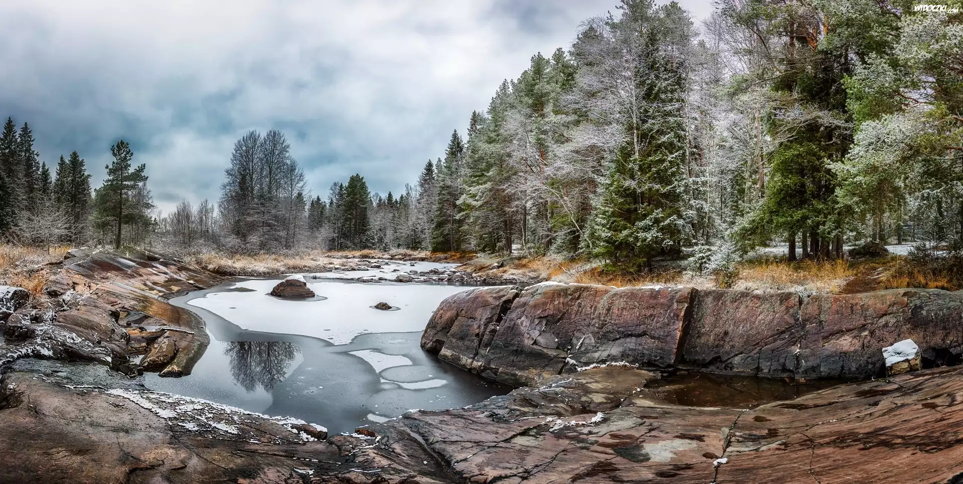 Zdjęcia, Finlandia, Koitelin, Rzeka Kiiminkijoki, Kamienie, Las, Skały, Drzewa
