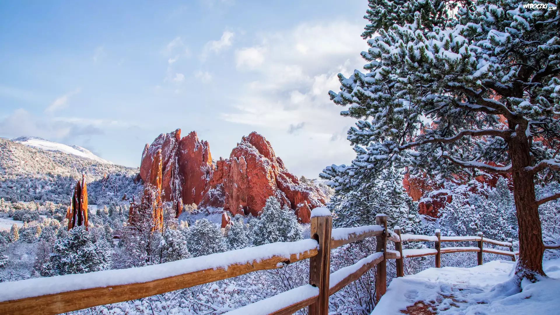 Zima, Góry, Drzewo, Sosna, Ogrodzenie, Garden of the Gods, Kolorado, Stany Zjednoczone