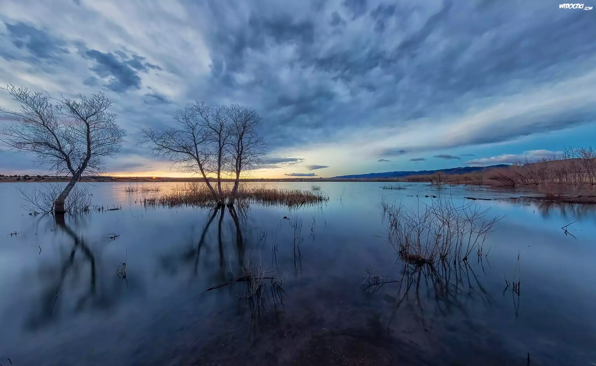 Poranek, Jezioro, Lake Chatfield, Chmury, Drzewa, Park stanowy Chatfield, Kolorado, Stany Zjednoczone |