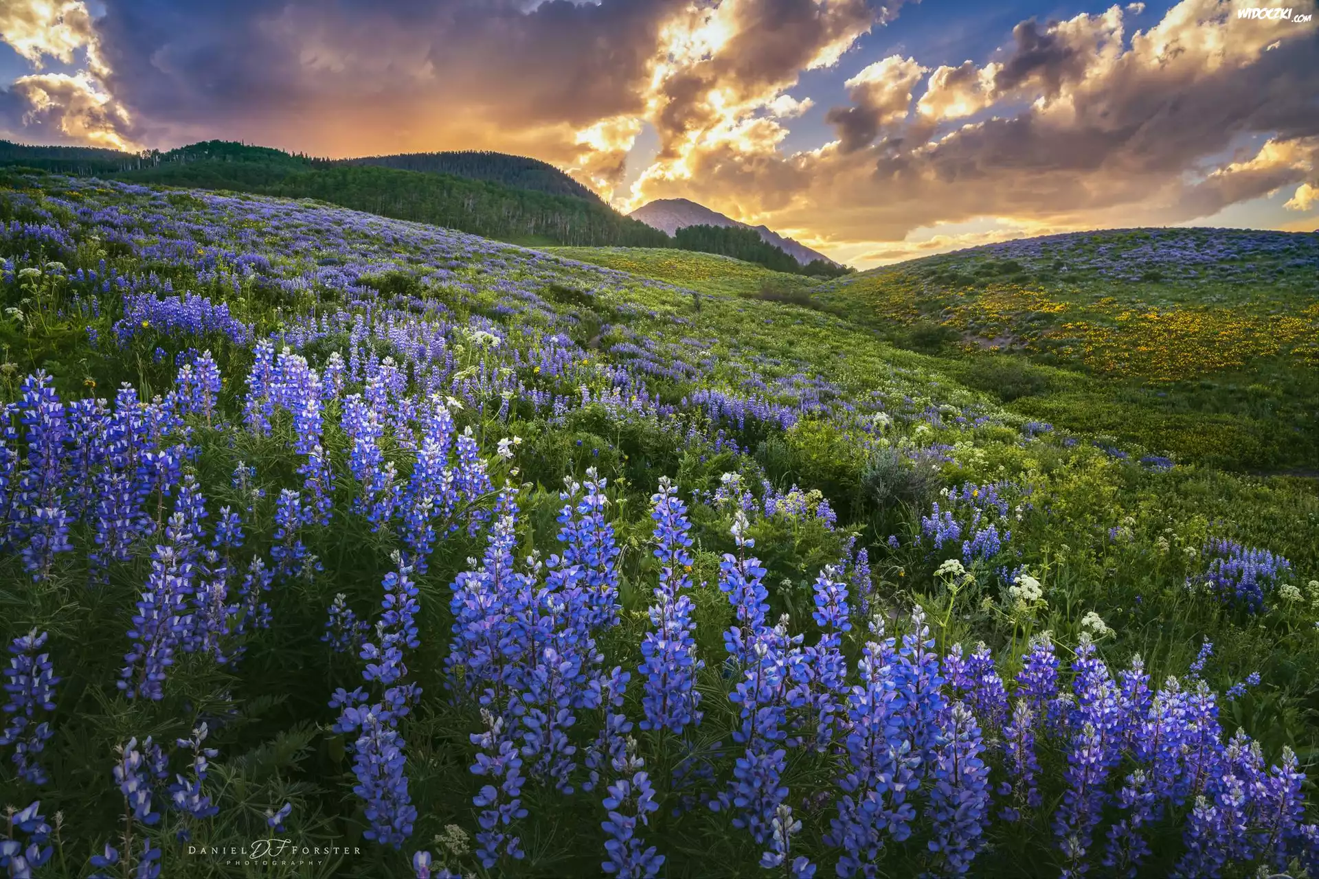 Stany Zjednoczone, Stan Kolorado, Góry, Elk Mountains, Łąka, Niebieskie, Łubiny, Zachód słońca, Chmury |
