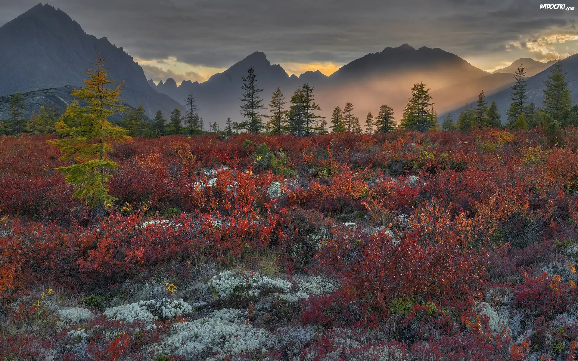 Jesień, Drzewa, Kolorowa, Roślinność, Ciemne, Chmury, Góry Kołymskie, Kołyma, Magadan, Rosja