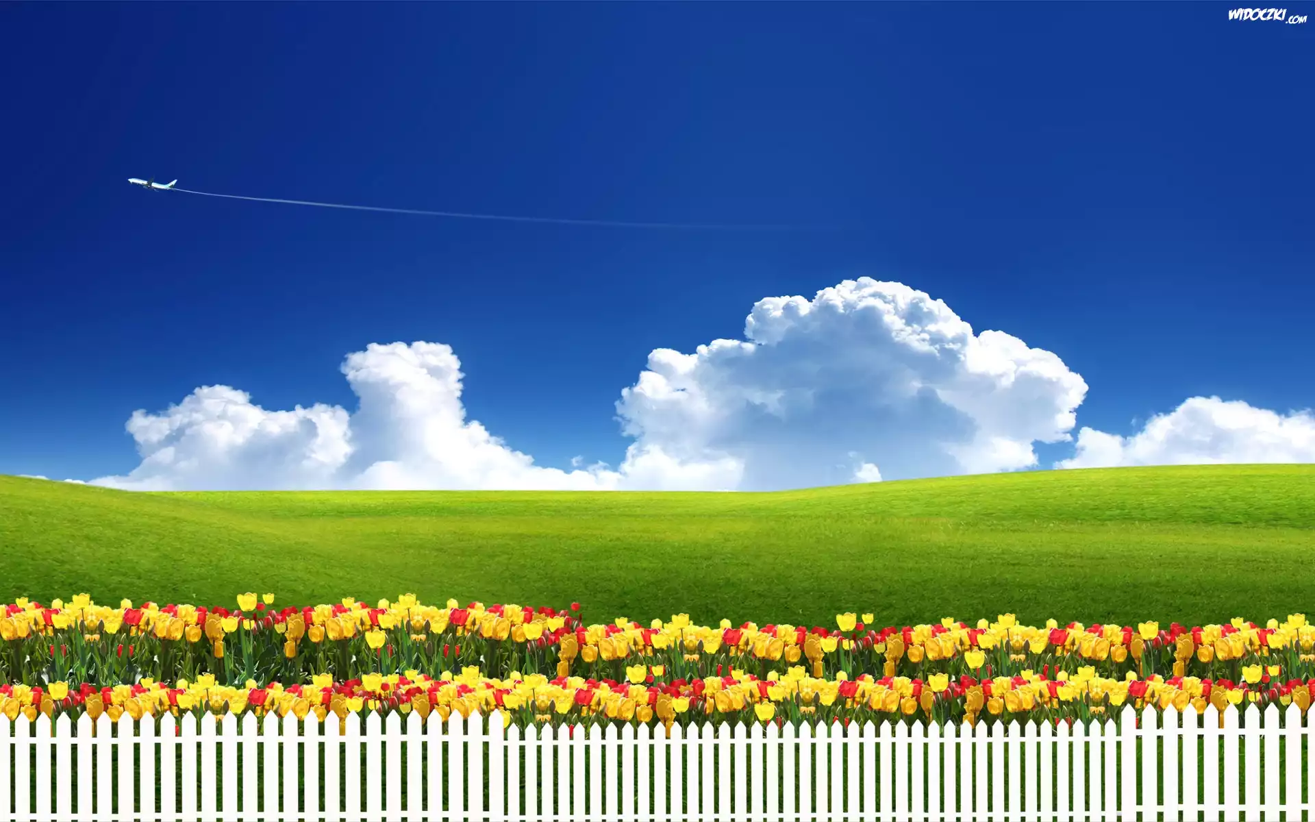 Zdjęcia, Kolorowe, Tulipany, Łąka, Biały, Płotek