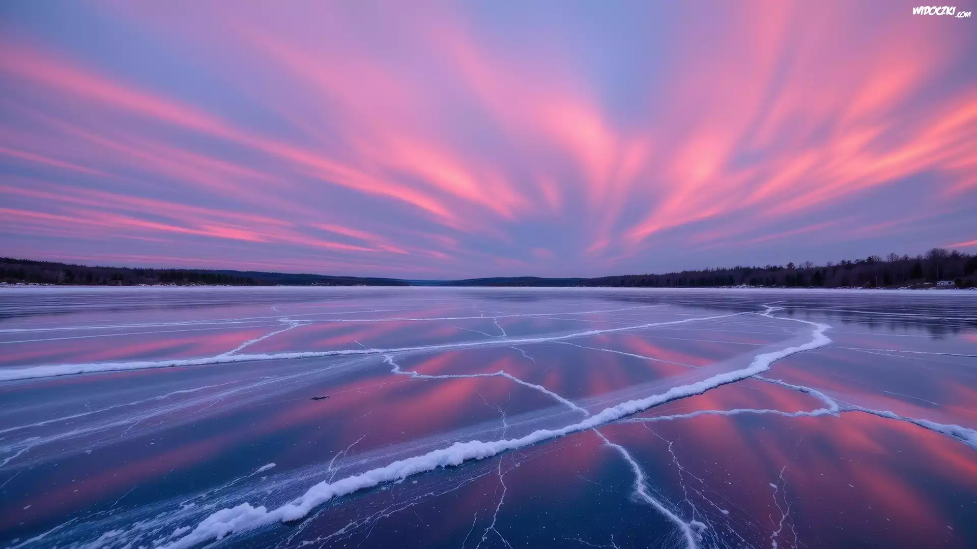 Zdjęcia, Zima, Zamarznięte, Jezioro, Kolorowe, Niebo, Drzewa